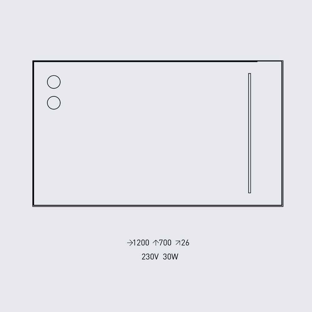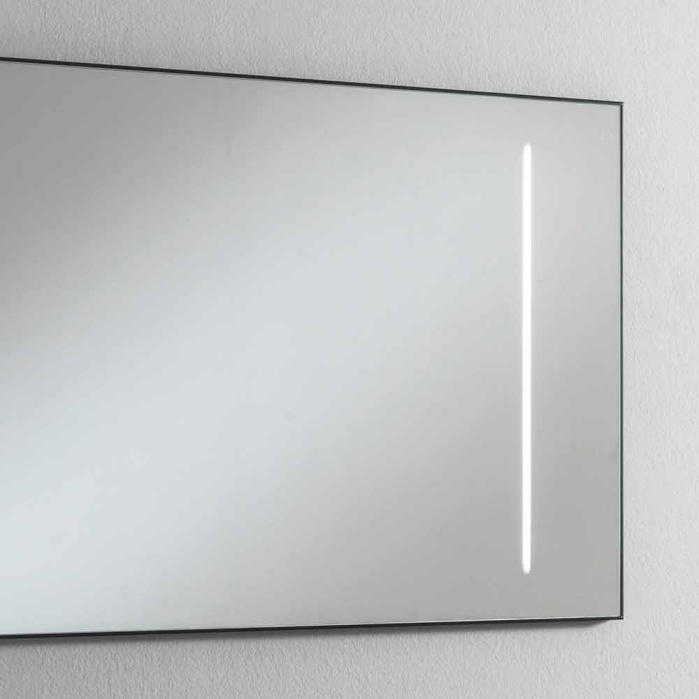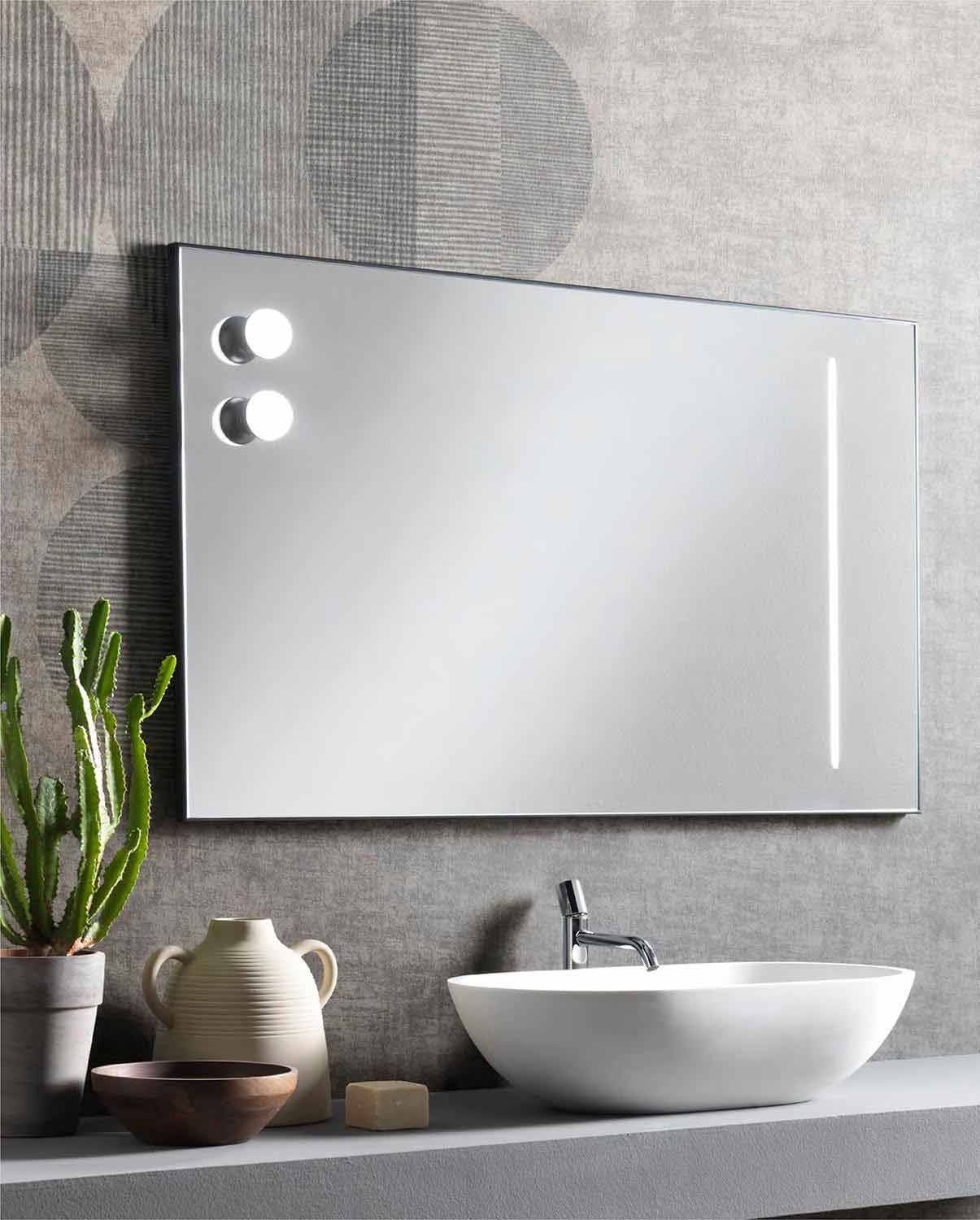 Pasqyrë muri drejtkëndëshe e punuar me dorë në Itali ,karakterizohet nga prania e dy llambave të integruara dhe një rreshti të dritës LED të futur në gotë, të disponueshme në dy variante. Prodhuar me një kornizë të zezë alumini ideale për t'u përshtatur me çdo nevojë dhe për të kompletuar mobilimin e dizajnit, duke i dhënë karakter dhe modernitet çdo zone të banjës.