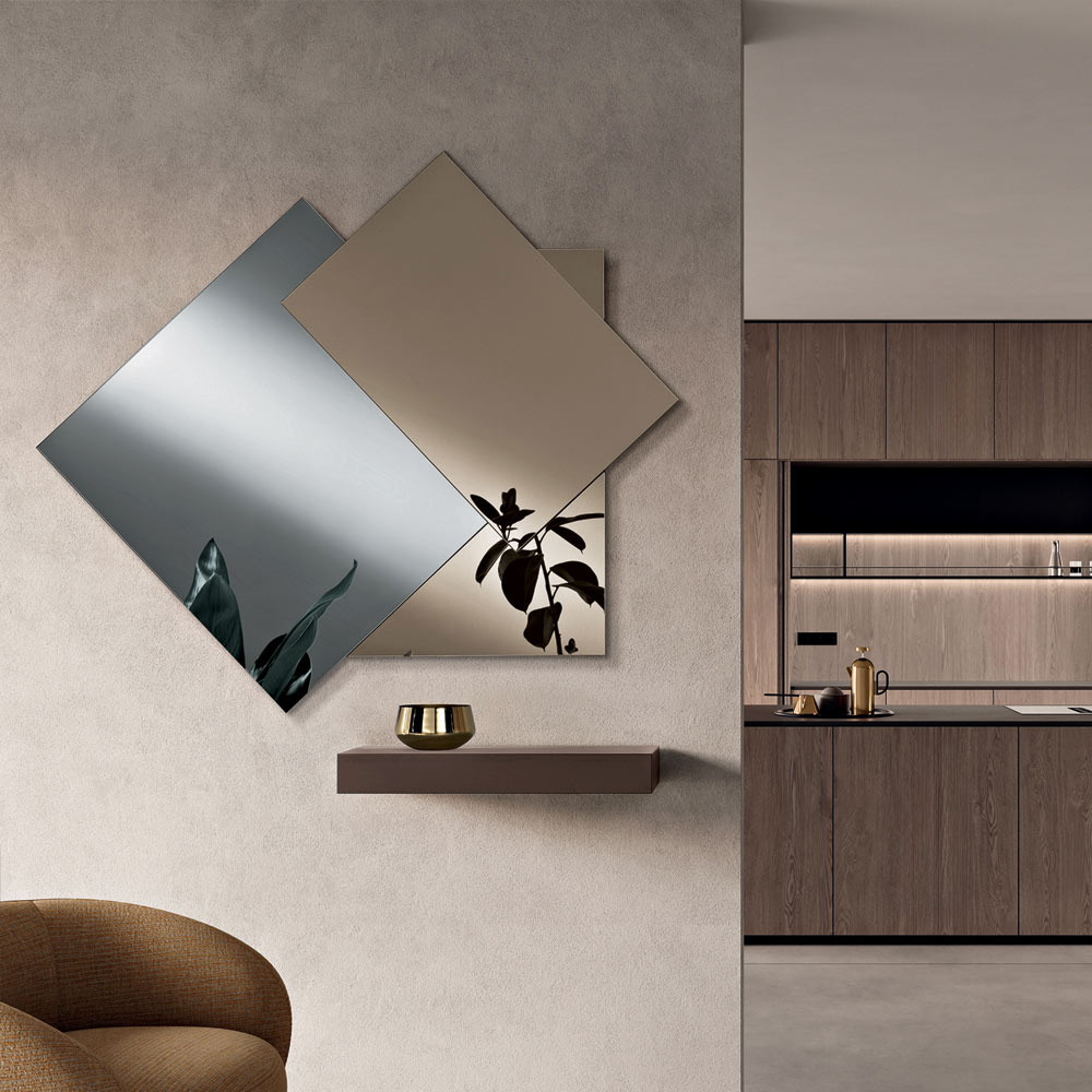 Rezultati është një pasqyrë me një karakter modern dhe dinamik, perfekte për hapësira bashkëkohore ku muri zë vendin qendror. Kombinimi i nuancave të ndryshme krijon reflektime të ngrohta dhe të sofistikuara, duke rritur shkëlqimin e dhomës.