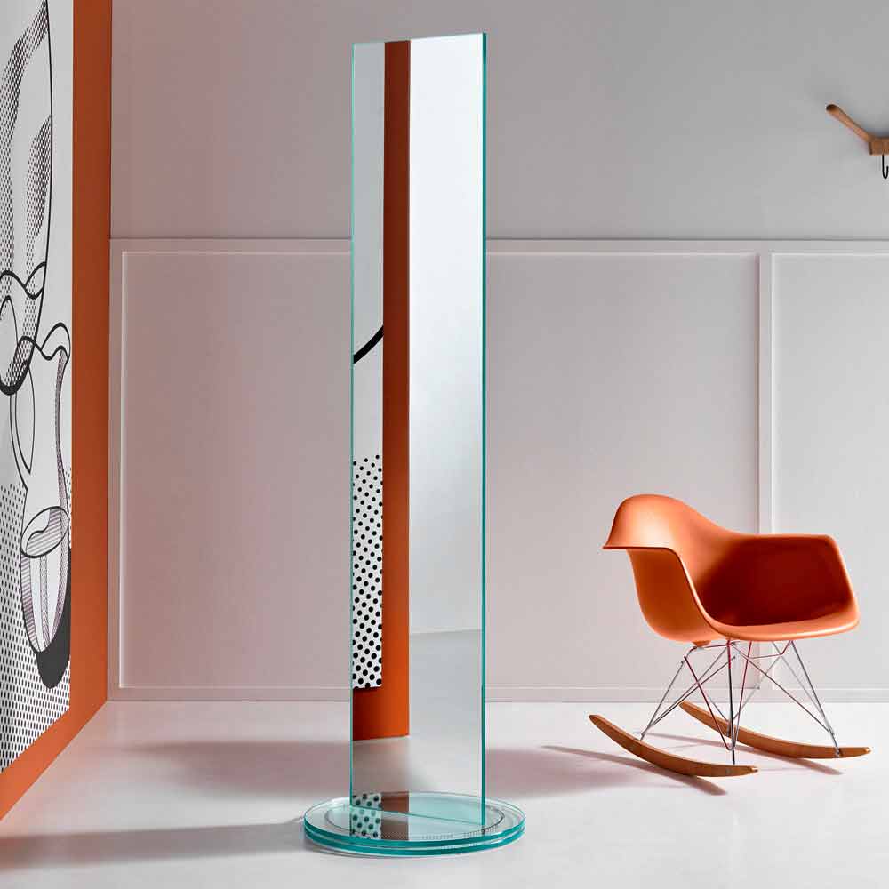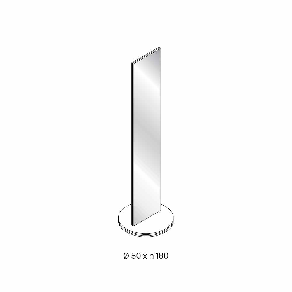 Kjo pasqyrë e pavarur karakterizohet nga dizajni i saj skulpturor i bërë tërësisht nga pasqyrë e dyanshme me bazë rrotulluese në xham të zbutur.