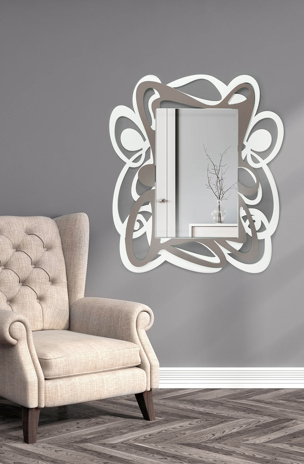 Pasqyrë e madhe muri në ngjyrë të bardhë dhe dru kakao e dekoruar dhe e prerë me lazer, e prodhuar në Itali.