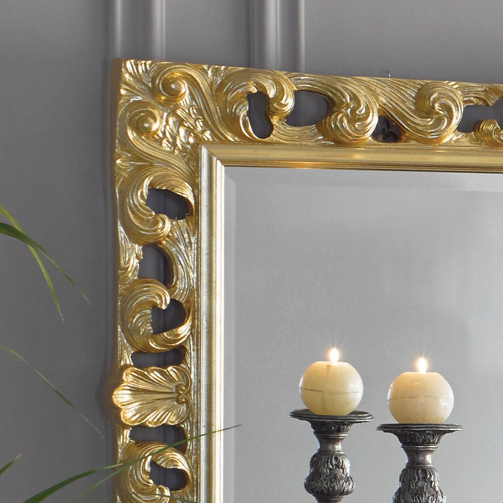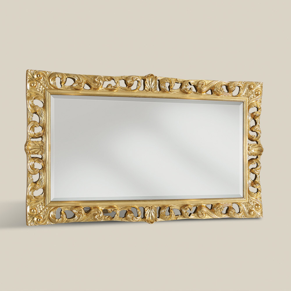 Pasqyrë klasike drejtkëndëshe me kornizë druri e zbukuruar me fletë ari . Me format e saj elegante dhe harmonike , është ideale për t'i dhënë çdo ambienti një prekje klasike dhe luksoze. Një komplement unik dhe i rafinuar , i bërë tërësisht në Itali nga mjeshtra të aftë , mjeshtër të artit që e përfundojnë çdo komplement me mençuri dhe shije për elegancë. Prodhimi kryhet duke përdorur materiale të shkëlqyera dhe duke kryer punënmedorë me kujdesin dhe profesionalizmin maksimal që i dallon produktet Made in Italy .