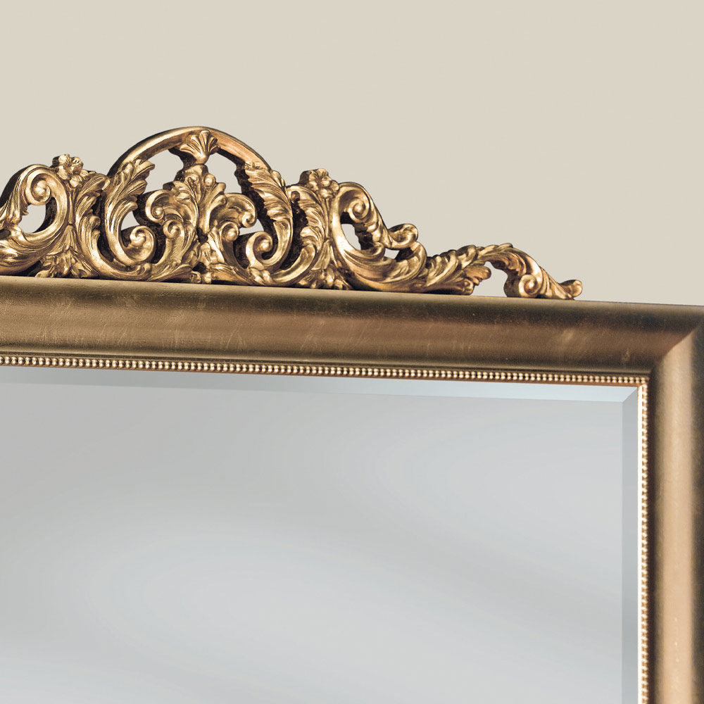 Pasqyrë elegante drejtkëndëshe me kornizë druri e zbukuruar me fletë ari me dekorim natyral.Falë stilit të saj klasik , kjo pasqyrë është ideale për t'i dhënë çdo dhomë një prekje elegante dhe luksoze . Një komplement unik dhe i rafinuar, i bërë tërësisht në Itali nga mjeshtra të aftë , mjeshtër të artit që përfundojnë çdo komplement me mençuri dhe shije për elegancë. Prodhimi kryhet duke përdorur materiale të shkëlqyera , dhe duke kryer punënmedorë me kujdesin dhe profesionalizmin maksimal që i dallon produktet Made in Italy .