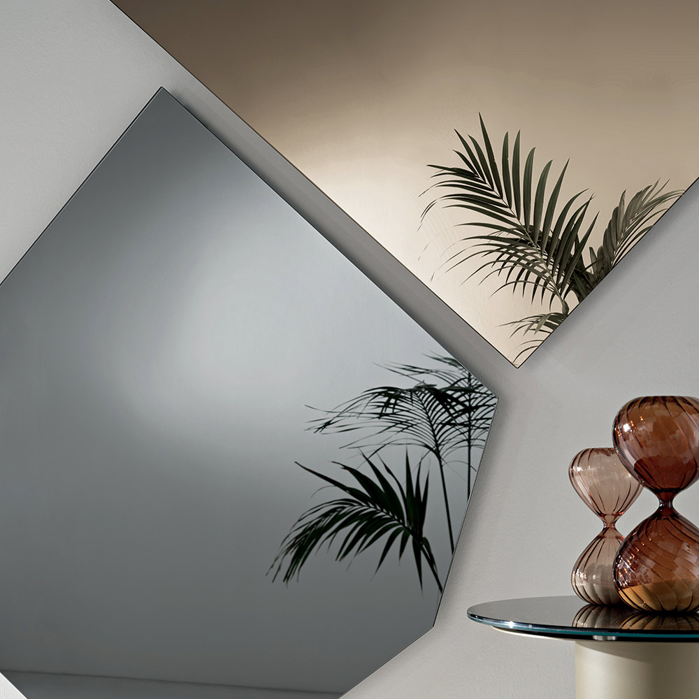E disponueshme në madhësi të ndryshme, pasqyra mund të përdoret individualisht ose e kombinuar për të krijuar efekte të sofistikuara gjeometrike në mur. Përfundimet elegante prej bronzi dhe të tymosura i shtojnë thellësi dhe ngrohtësi sipërfaqes reflektuese.