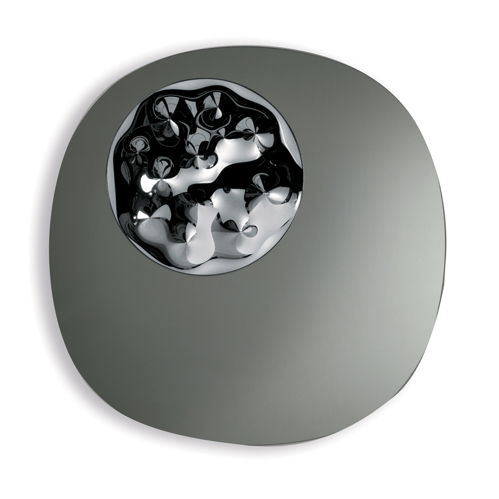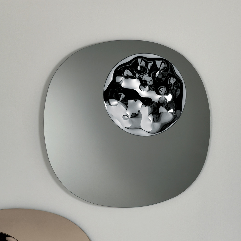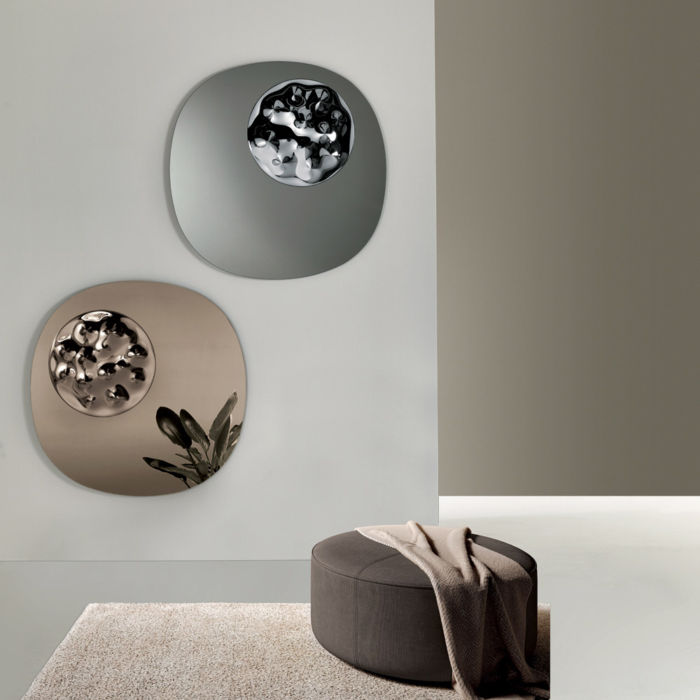 Dizajni është zbukuruar me një shtresë rrethore dalluese në xham të lakuar me ton në ton , të pozicionuar në njërën anë të kornizës. Ky detaj krijon një lojë të rafinuar drite dhe reflektimesh që pasuron sipërfaqen e pasqyrës me një prekje origjinale dhe bashkëkohore.