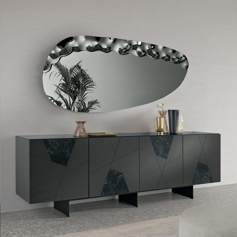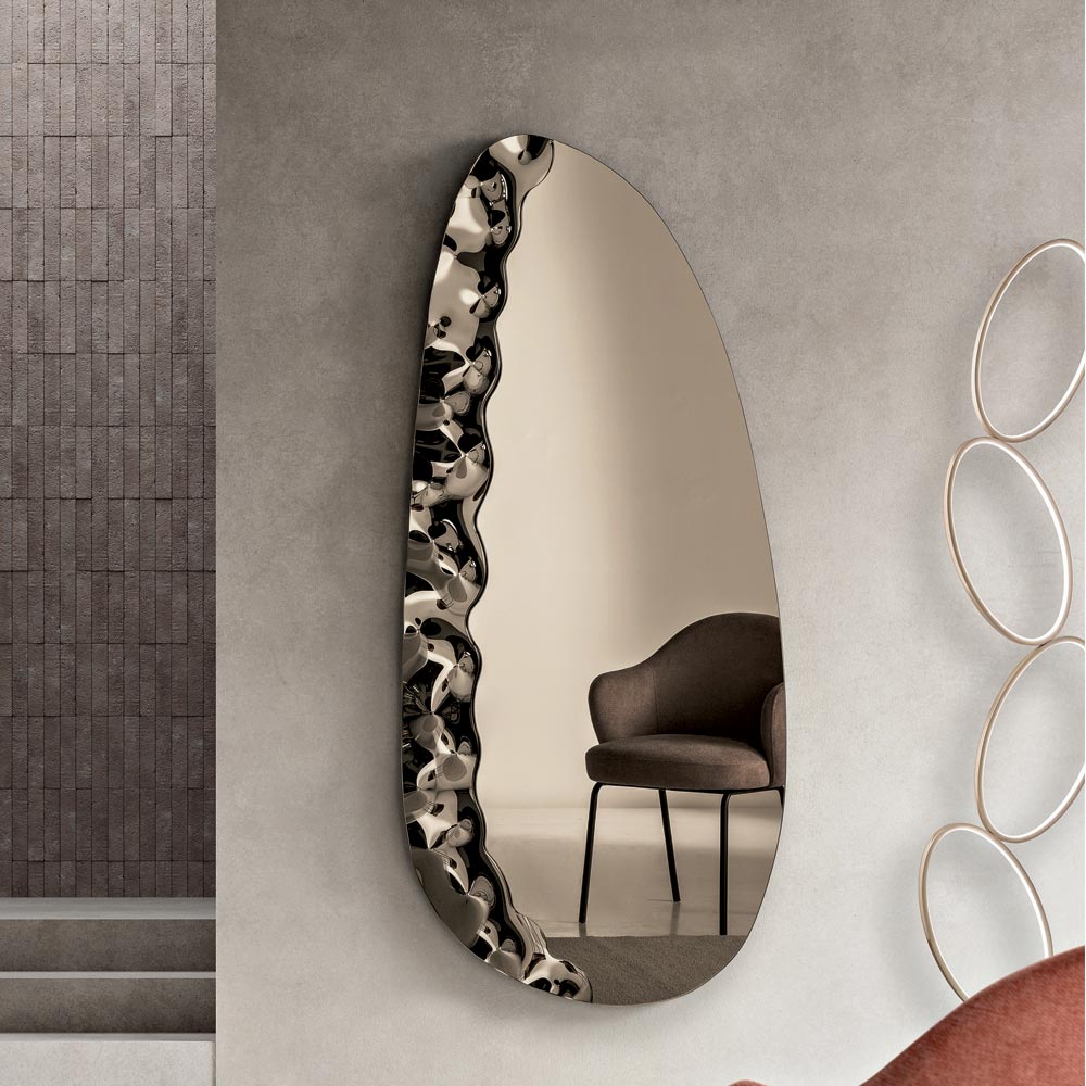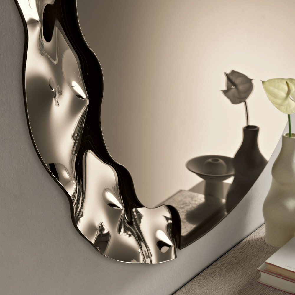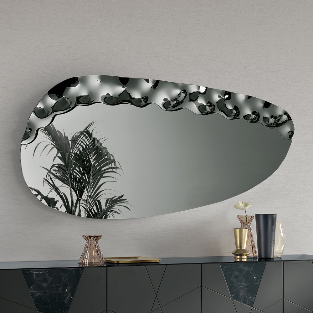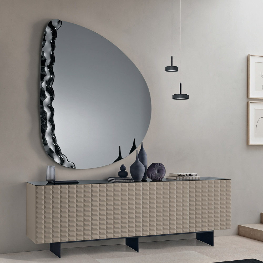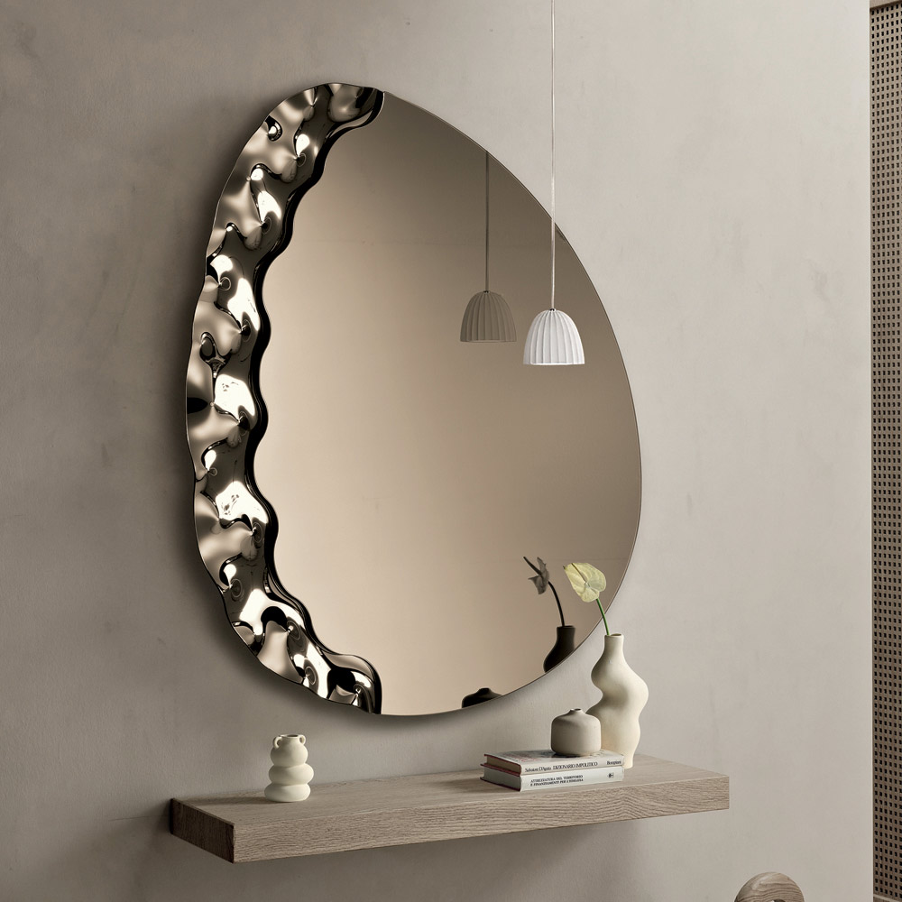 Një pasqyrë elegante muri e projektuar në Itali , ideale për të përmirësuar hapësira të tilla si hyrja , dhoma e ndenjes ose dhoma e gjumit . Dizajni i saj bashkëkohor kombinon linja të buta dhe detaje me teksturë, duke e transformuar pasqyrën në një element dekorativ të rafinuar, i aftë të përmirësojë në mënyrë elegante murin.