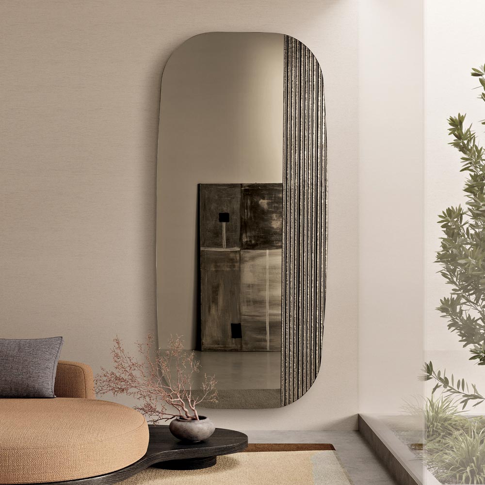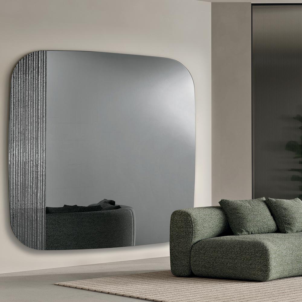 Sipërfaqja reflektuese paraqet një formë të konturuar me cepa të rrumbullakosura butësisht , të projektuara për të krijuar një efekt vizual të butë dhe harmonik. Dizajni është zbukuruar me një shtresë qelqi të argjendtë me brinjë në të njëjtën ngjyrë që shton thellësi dhe lëvizje, duke krijuar një ndërveprim të rafinuar të dritës dhe teksturës në sipërfaqen e pasqyrës.