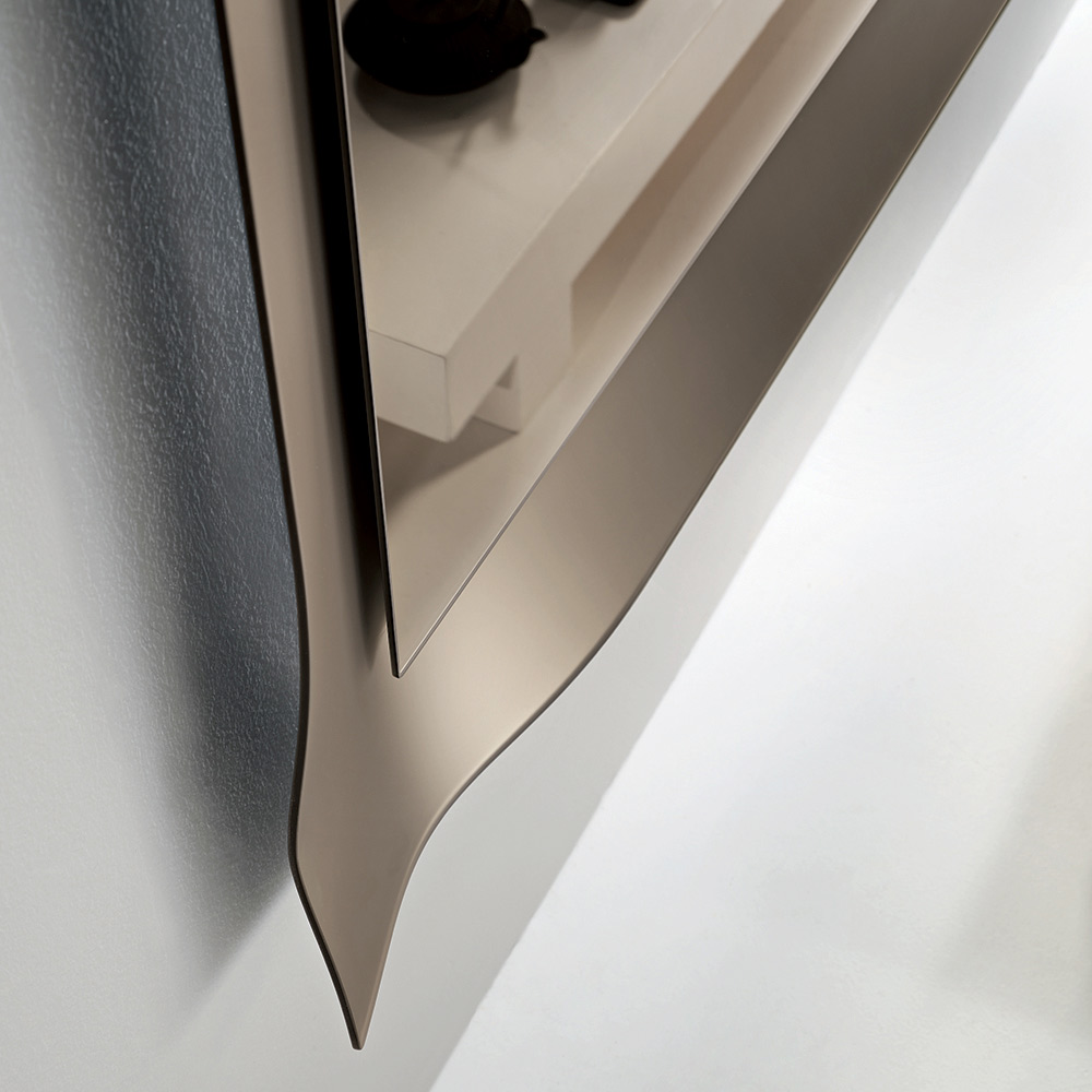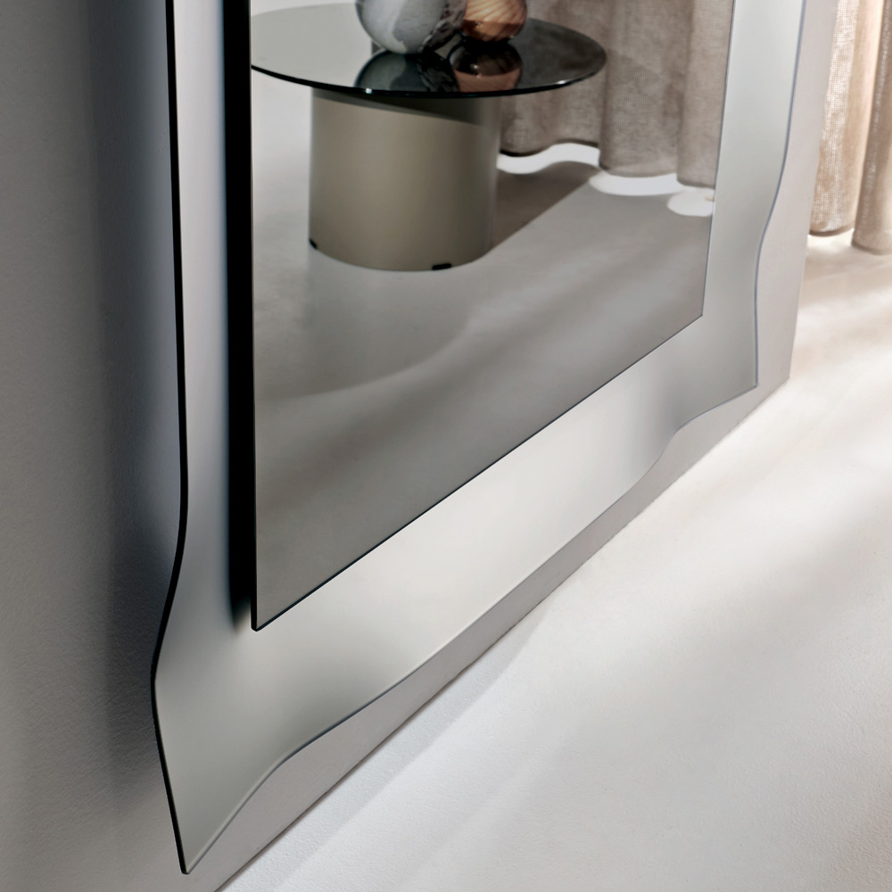 Sipërfaqja reflektuese është e rrethuar nga një kornizë qelqi e mbuluar me akull me cepa pak të lakuar . Ky proces kap dhe thyen dritën me delikatesë, duke krijuar një lojë elegante reflektimesh që gjallëron sipërfaqen dhe i jep pasqyrës thellësi.