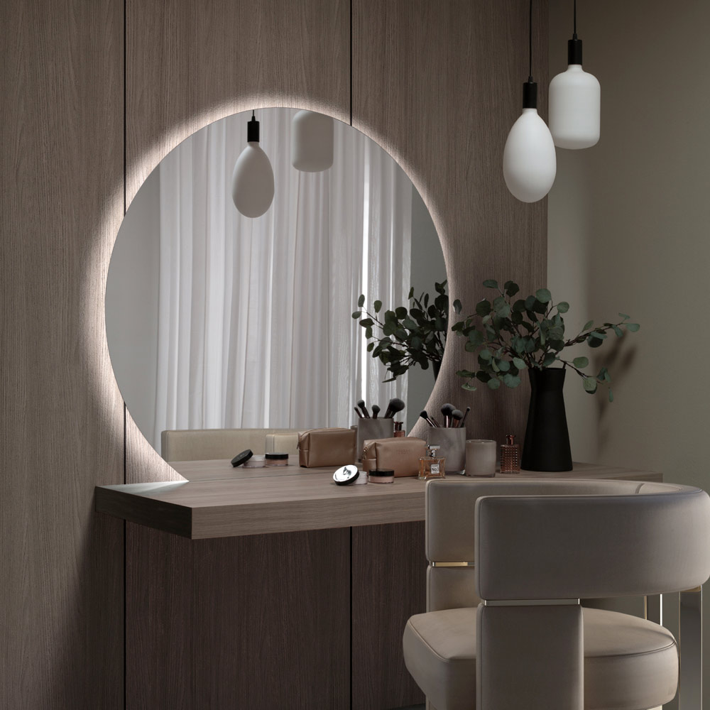 Kjo pasqyrë rrethore është një kryevepër e dizajnit që mishëron elegancën dhe modernitetin. Ndriçimi i pasmë që ndjek profilin e tij jep një shkëlqim eterik dhe një dritë të butë që përmirëson çdo mjedis, duke krijuar një atmosferë intime dhe të rafinuar. Forma e rrumbullakët e pasqyrës, një zgjedhje stili e përjetshme, reflekton dhe amplifikon dritën natyrale dhe bukurinë e hapësirës përreth. E përkryer për hyrjen, banjën ose si pikë qendrore në dhomën e ndenjes, kjo pasqyrë me dritë prapa nuk është thjesht një element reflektues, por një objekt i vërtetë mobilimi që ndërthur formën dhe funksionin, bukurinë dhe shkëlqimin, për një rezultat të stilit dhe atmosferës së pastër. .