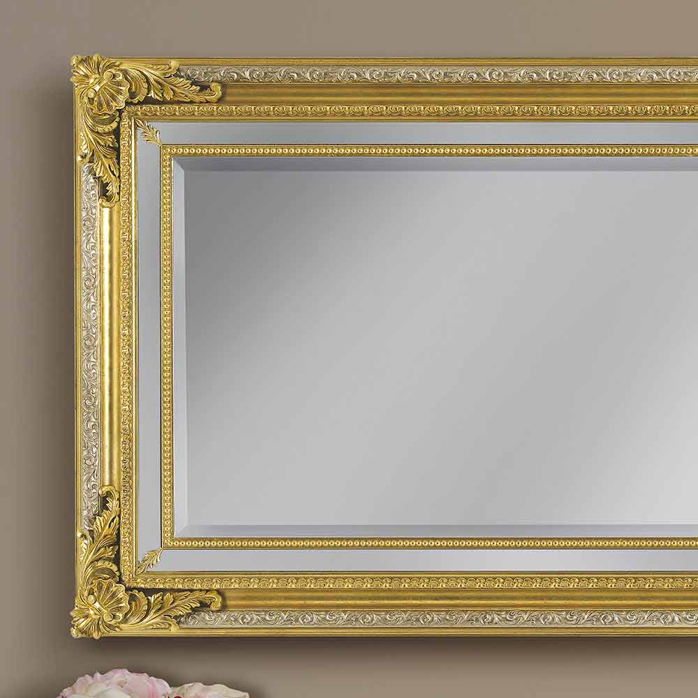 Kjo pasqyrë elegante është një shembull i ndritshëm i bukurisë dhe mjeshtërisë. Korniza është një triumf i dizajnit klasik, i pasuruar me detaje të ndërlikuara dhe frize që kapin dritën dhe sharmin e epokës barok. Çdo cep është zbukuruar me zbukurime me lule dhe motive epshore që shkrihen në një kornizë madhështie të pastër.