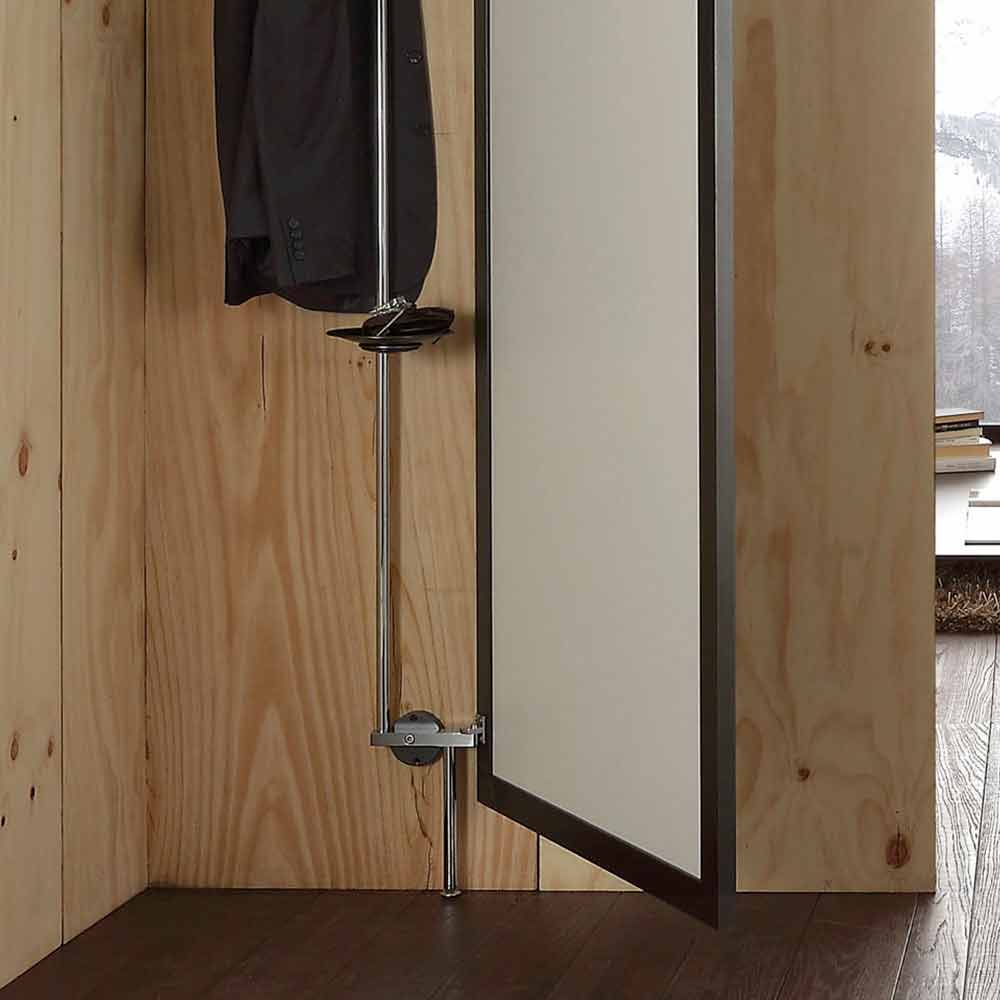 Pasqyrë inovative e murit në xham të tymosur me hapje të bërë në Itali me kornizë metalike të pikturuar në të zezë e kompletuar me sistem muri metalik të kromuar duke përfshirë 3 grepa pallto dhe një pllakë praktike ruajtje. Një dizajn jashtëzakonisht i thjeshtë dhe thelbësor është i kombinuar me një ide origjinale dhe inovative, duke i dhënë kështu jetë një zgjidhje funksionale mobilimi të aftë për tu përshtatur me çdo mjedis brenda të cilit krijon një hapësirë të fshehtë për t'iu dedikuar organizimit të objekteve të ndryshme. Struktura e saj është projektuar për hapësirat këndore të shtëpisë që shpesh nuk përdoren por që mund të shndërrohen në zona praktike në të cilat vendosen çanta, pallto dhe më shumë, duke arritur të ruajnë një mjedis të pastër dhe të rregullt.