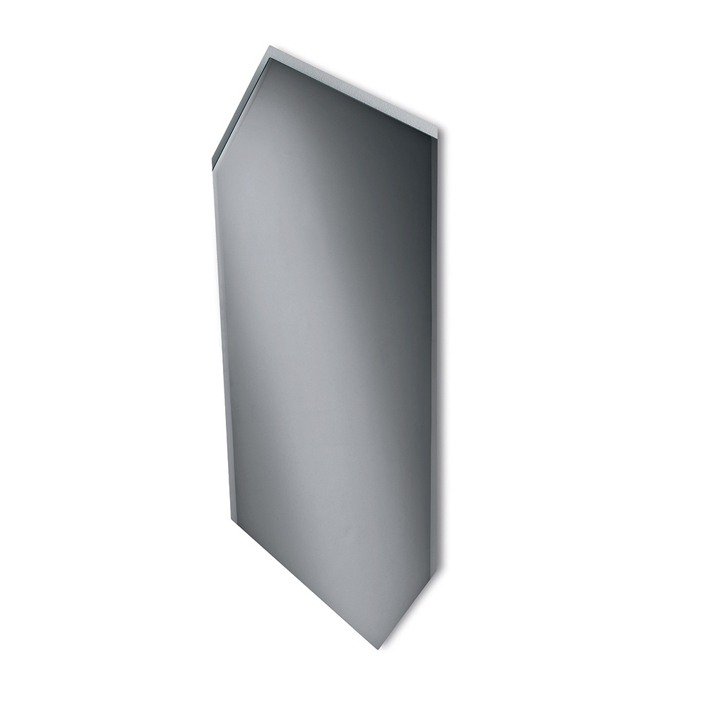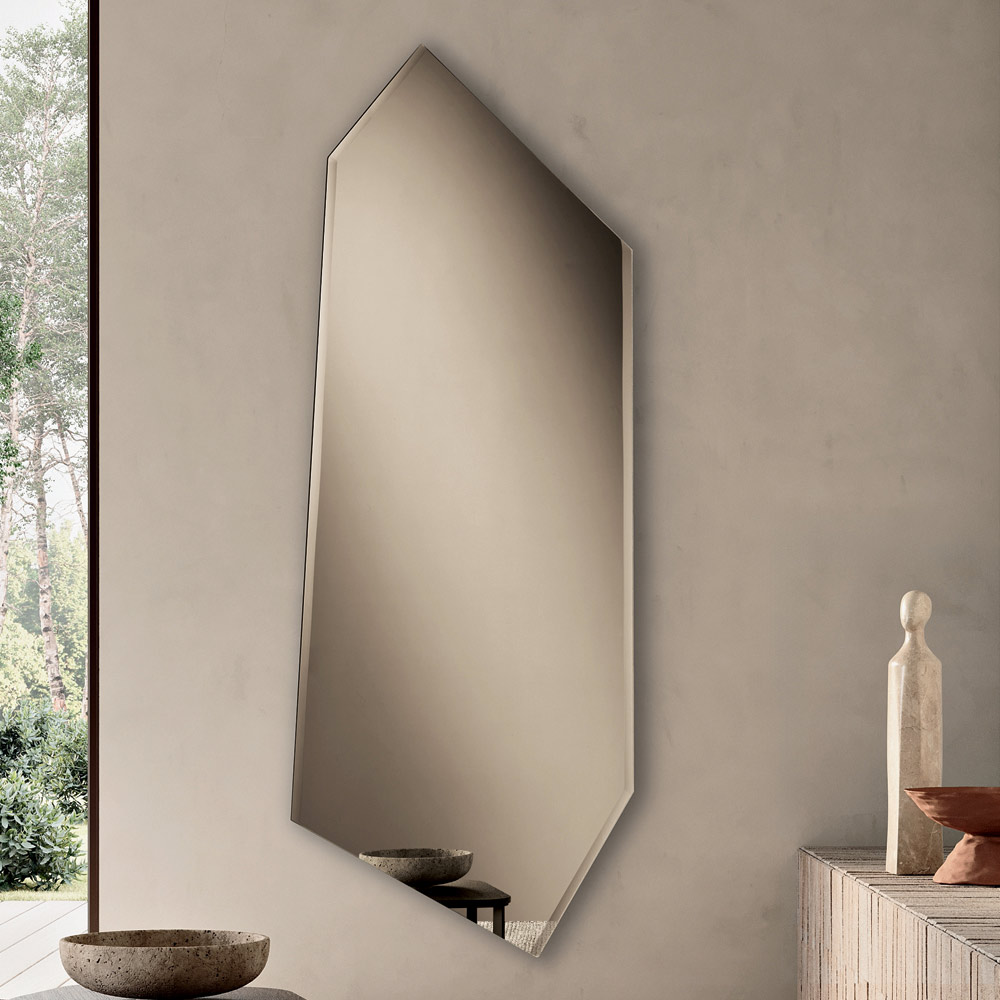 Pasqyra ka një formë të çrregullt që të kujton një drejtkëndësh të hapur në gjashtë anët, duke krijuar një siluetë moderne dhe jokonvencionale. Profili është i zbukuruar me një pjerrësi të pjesshme në të katër anët , një detaj diskret por i çmuar që thekson konturet dhe i shton shkëlqim sipërfaqes reflektuese.