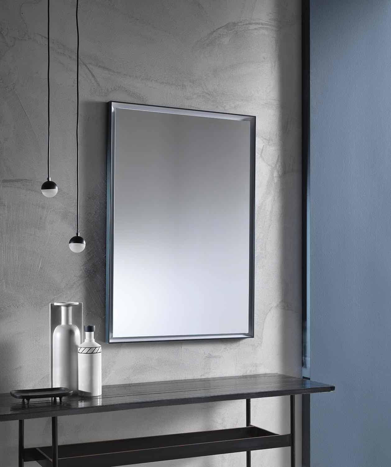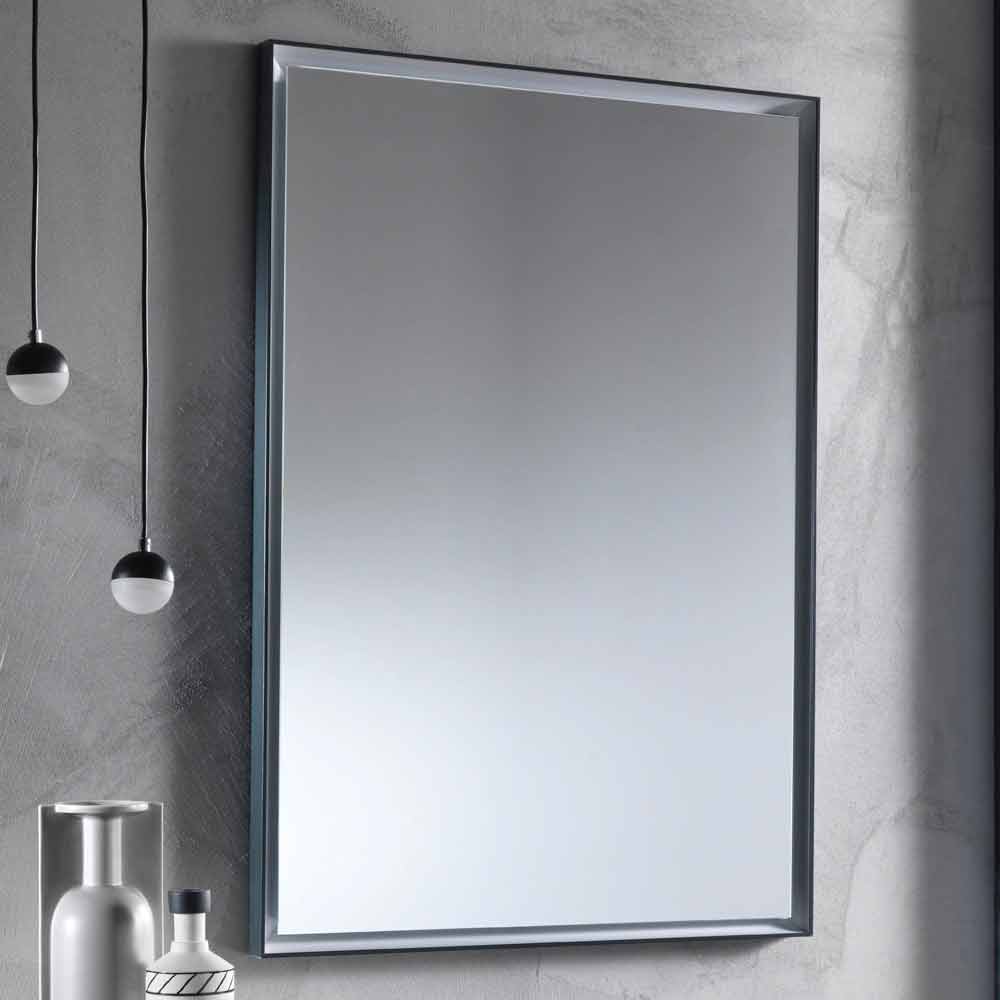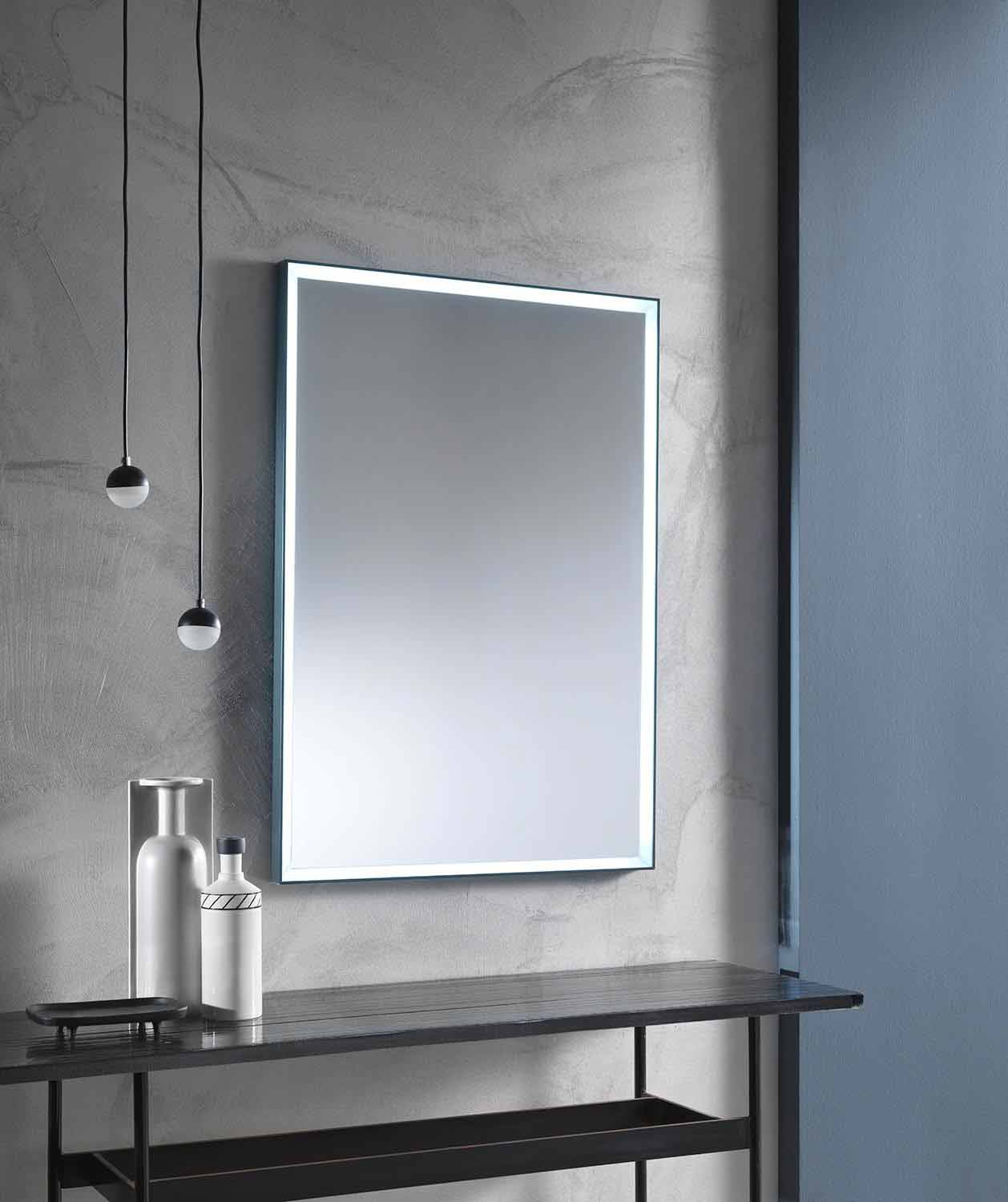 Pasqyrë muri me dizajn drejtkëndor modern me kornizë alumini dhe dritë LED Made in Italy.