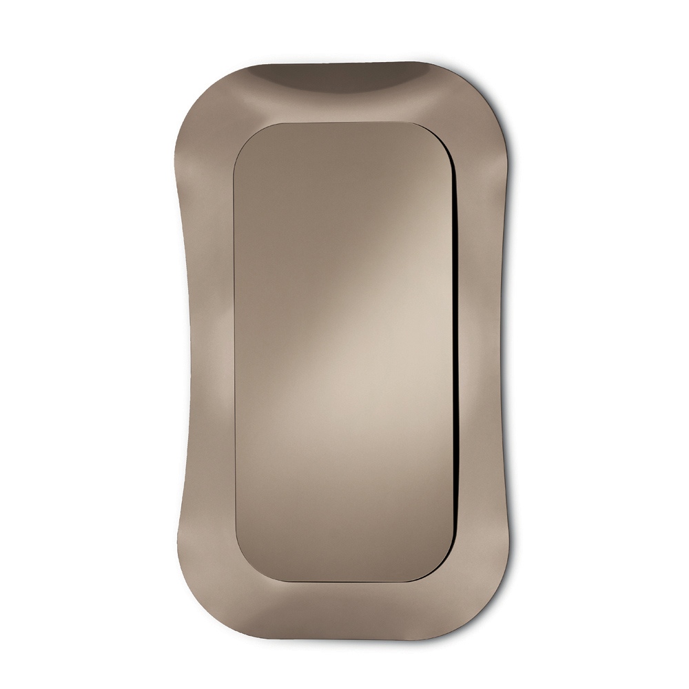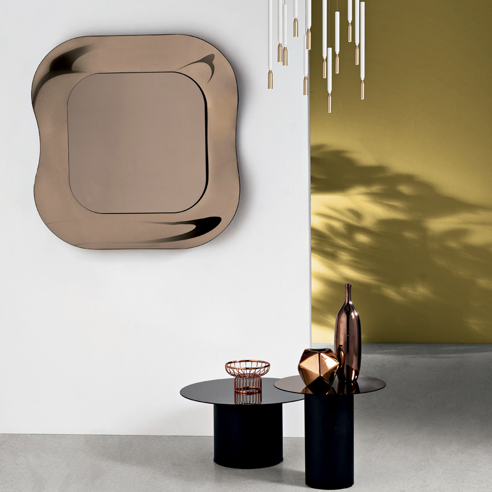 Pasqyra qendrore , e vendosur në kornizë si një element pak i varur, i jep thellësi kompozimit dhe thekson ekuilibrin midis sipërfaqes reflektuese dhe strukturës dekorative. Rezultati është një aksesor i sofistikuar mobilimi, perfekt për hapësira moderne dhe të rafinuara.