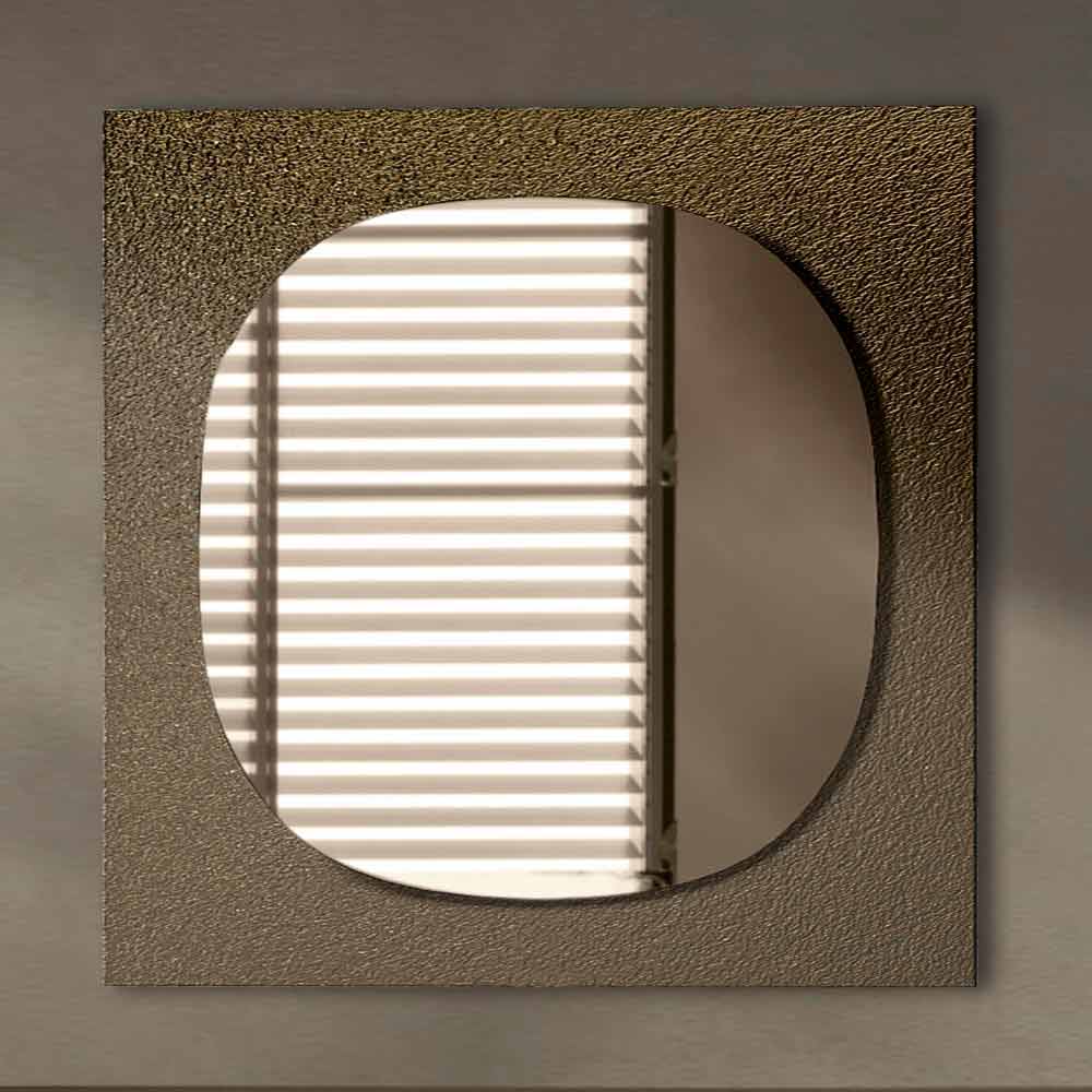 Pasqyrë muri e prodhuar tërësisht në Itali me kornizë qelqi të falsifikuarprej bronzi dhe pasqyrë ovale të mbivendosur gjithashtu në fund bronzi. Një objekt dizajni i konceptuar dhe konceptuar për të pasuruar mobilimin e hapësirave të shtëpisë së dikujt me të gjithë vlerën dhe cilësinë e Made in Italy , duke i dhënë kështu jetë një aksesori mobilimiekskluziv dhe me cilësi të lartë . Përdorimi i teksteve të ndryshme nënvizon veçantinë e saj dhe pasuron pasqyrën me personalitet dhe elegancë për një rezultat origjinal që vjen nga konceptet e krijimtarisë dhe inovacionit falë një eksperimentimi të materialeve dhe estetikës që nuk vendos kufij.