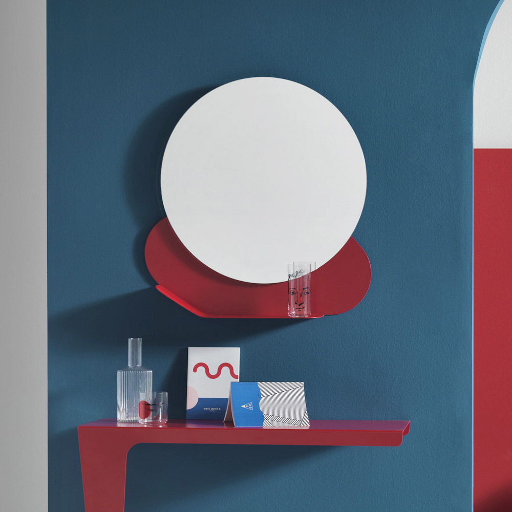 Kjo pasqyrë muri me dizajn modern përshtatet në kontekste të reja falë raftit të poshtëm në metal me ngjyrë me ngjyra të gjalla dhe bashkëkohore, e cila kufizon format e rrumbullakëta të pasqyrës dhe krijon vazhdimësi me mjedisin përreth. Një produkt praktik dhe funksional me një dizajn origjinal dhe me gaz në gjendje të karakterizojë kontekste të ndryshme, nga hyrja në dhomën e ndenjes, si dhe në banjë ose dhomë gjumi.