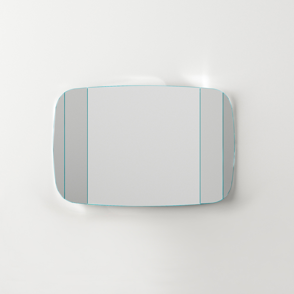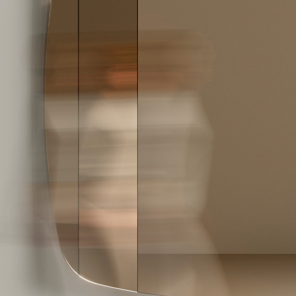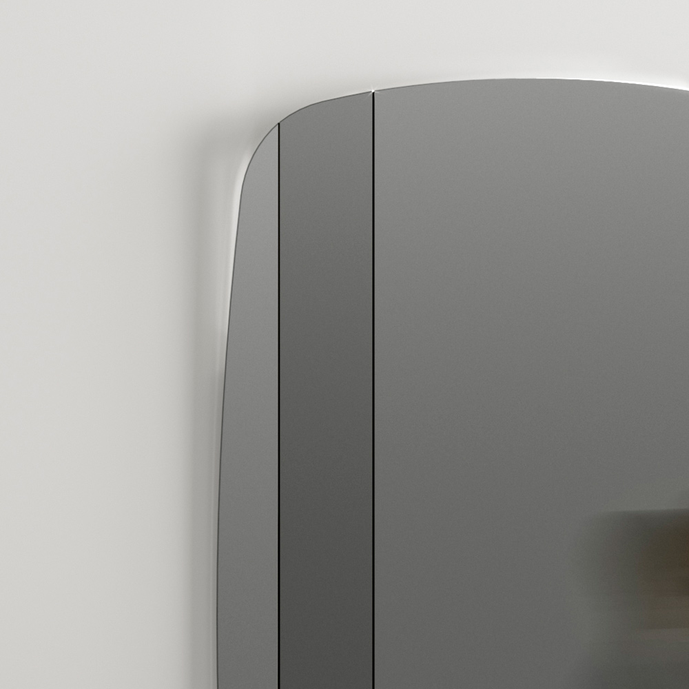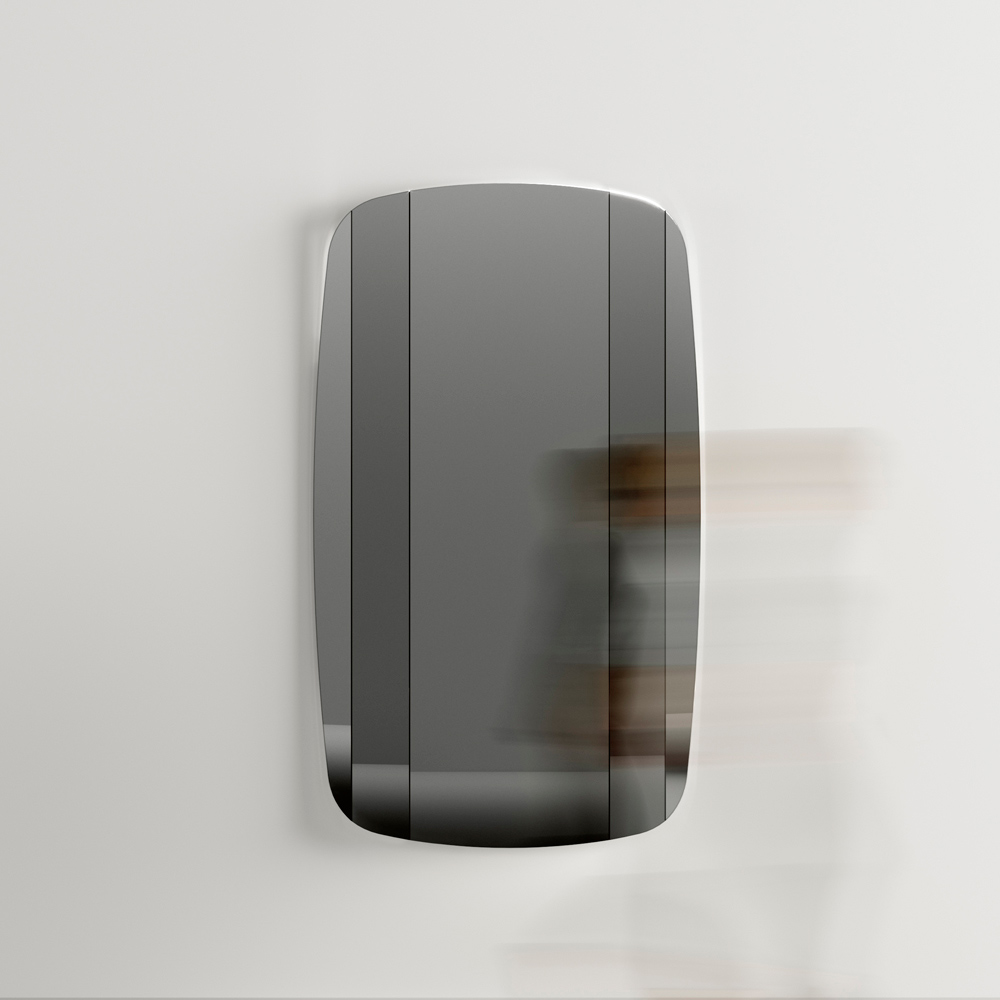 Pasqyrë muri vertikale ose horizontale me strukturë druri të lyer me ngjyrë të zezë. Pasqyrat anësore të pjerrëta janë një detaj unik dhe i veçantë.