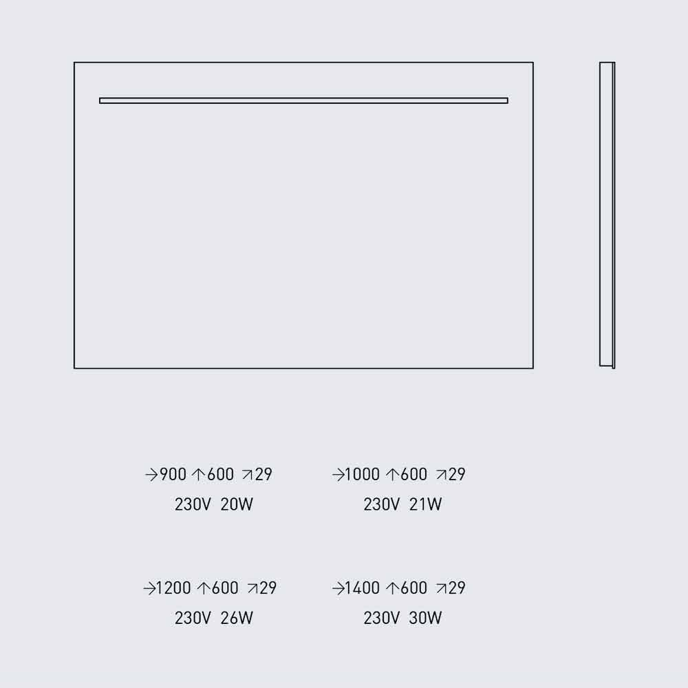 Pasqyrë muri drejtkëndëshe epunuar me dorë në Itali me lëndë të parë cilësore. Përbëhet nga një kornizë çeliku dhe karakterizohet nga një brez horizontal me rërë, për daljen e përparme dhe të sipërme të dritës LED , e cila mund të aktivizohet përmes një çelësi me prekje . Ju mund të zgjidhni ngjyrën e dritës, midis të bardhës së ngrohtë dhe të bardhë natyrale.