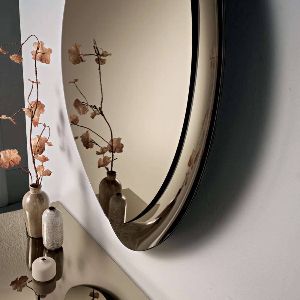 Dizajni paraqet një gjysmëkornizë dalluese prej qelqi të shkrirë ton-mbi-ton që e kornizon pjesërisht sipërfaqen reflektuese. Ky detaj shton teksturë dhe shkëlqim , duke krijuar një lojë magjepsëse reflektimesh që i jep pasqyrës thellësi dhe karakter.