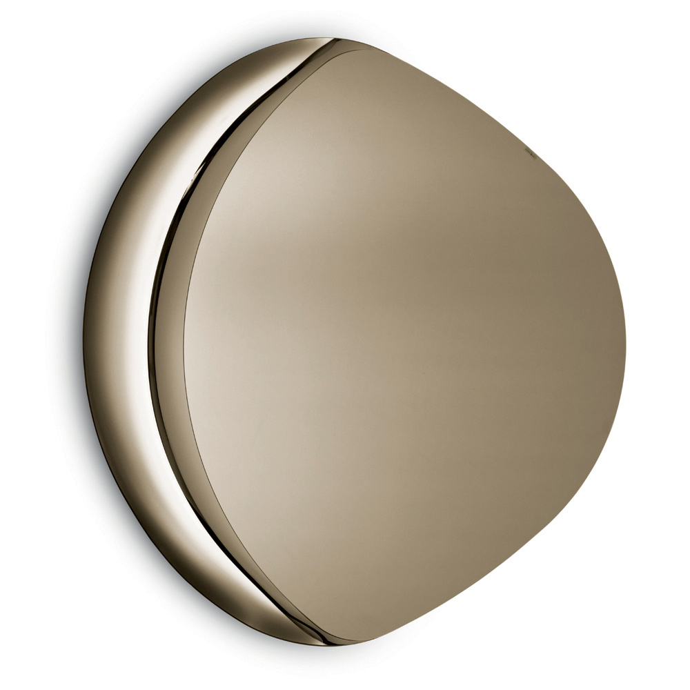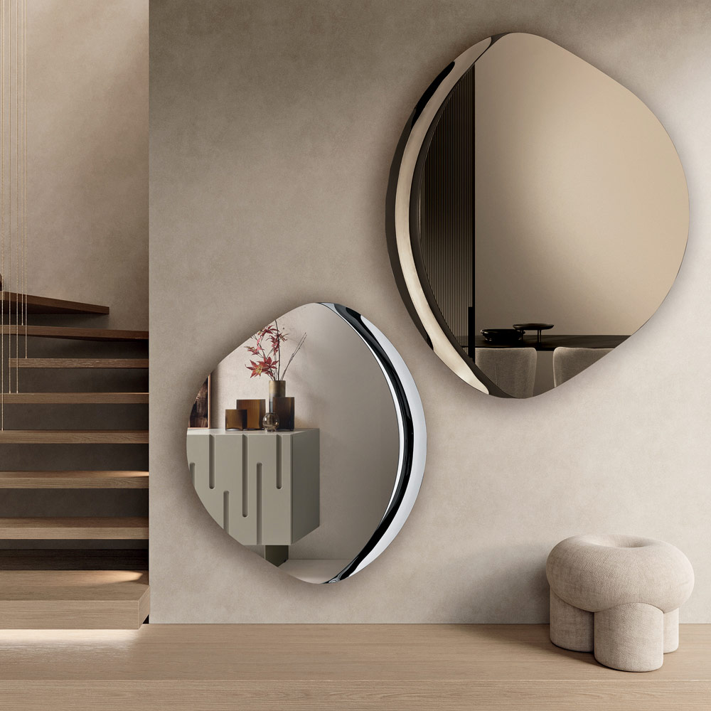 Falë estetikës së saj skulpturale dhe përmasave elegante, kjo pasqyrë është një aksesor ideal mobilimi për hapësira moderne dhe të sofistikuara, e aftë të amplifikojë dritën dhe ta pasurojë murin me një prekje dizajni bashkëkohor.