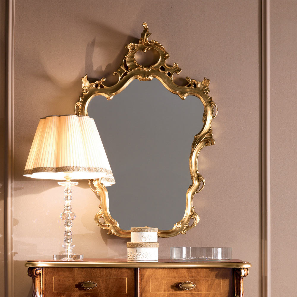 Pasqyrë e stilit klasik me kornizë në formë të përfunduar me fletë ari , ideale për të dekoruar çdo ambient me personalitet dhe origjinalitet. Një komplement unik dhe i rafinuar, i bërë tërësisht në Itali nga mjeshtra të aftë , mjeshtër të artit që përfundojnë çdo komplement me mençuri dhe shije për elegancë. Prodhimi kryhet duke përdorur materiale të shkëlqyera , dhe duke kryer punënmedorë me kujdesin dhe profesionalizmin maksimal që i dallon produktet Made in Italy .