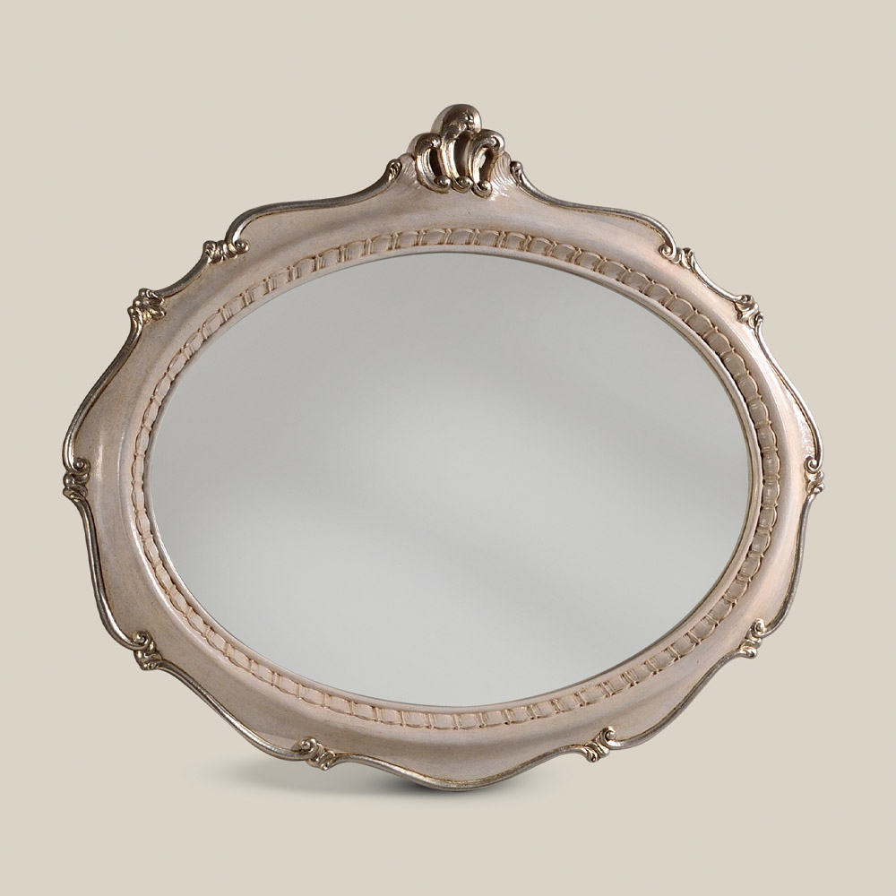 Pasqyrë ovale me kornizë druri meka argjendi të vjetëruar, bazë e patinuar, me një stil klasik dhe elegant, perfekte për të dekoruar zonën tuaj të jetesës me një prekje të personalitetit të rafinuar. Një komplement unik dhe i rafinuar, i prodhuar tërësisht në Itali nga mjeshtra mjeshtër të aftë , mjeshtër të artit që përfundojnë çdo komplement me mençuri dhe shije për elegancë. Prodhimi kryhet duke përdorur materiale të çmuara , dhe kryerja e punimevemedorë me kujdesin dhe profesionalizmin maksimal që i dallon produktet Made in Italy .