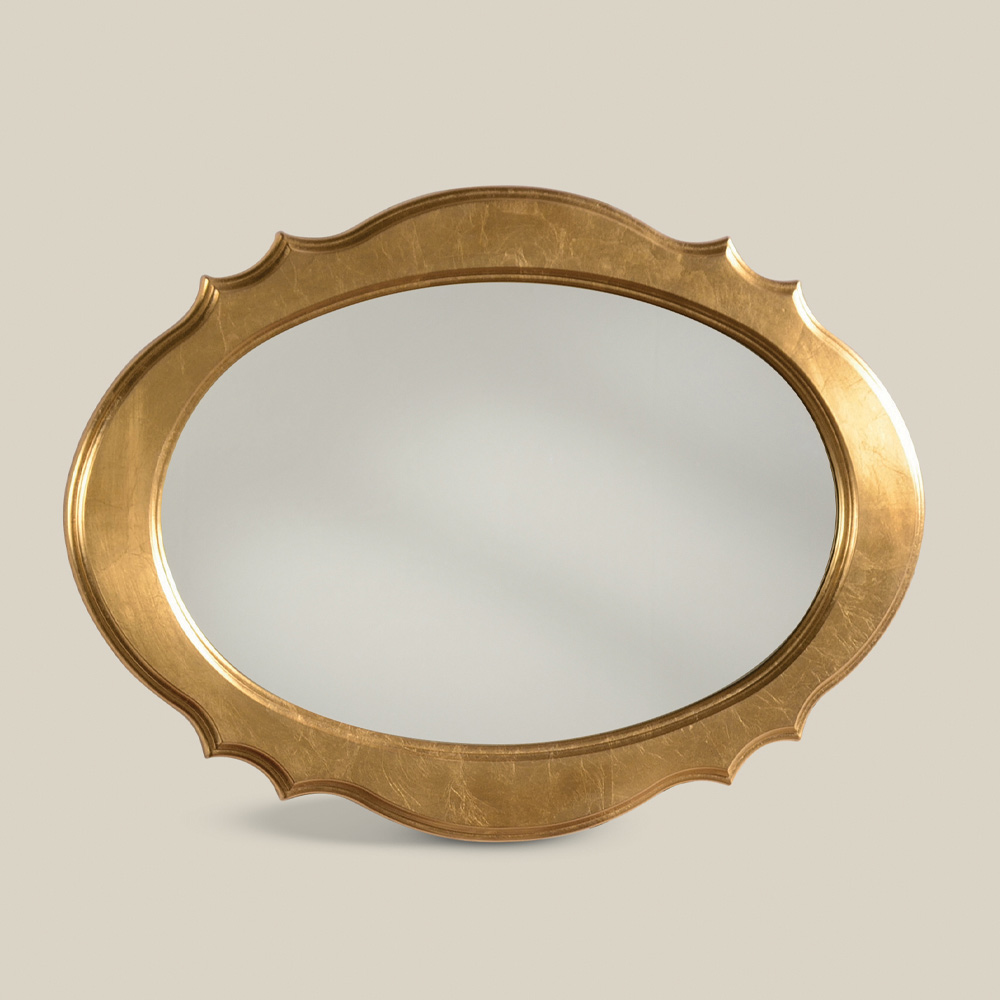 Pasqyrë muri në formë ovale të stilit klasik me kornizë druri dhe zbukuruar me fletë elegante ari , perfekte për të dekoruar me personalitet dhe shije ambientin tuaj të jetesës. Një komplement unik dhe i rafinuar, i bërë tërësisht në Itali nga mjeshtra të aftë , mjeshtër të artit që përfundojnë çdo komplement me mençuri dhe shije për elegancë. Prodhimi kryhet duke përdorur materiale të shkëlqyera , dhe duke kryer punënmedorë me kujdesin dhe profesionalizmin maksimal që i dallon produktet Made in Italy .