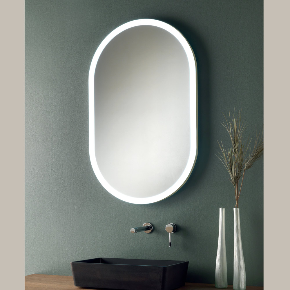 Profili ovale përcaktohet nga një kornizë metalike që përqafon me delikatesë pasqyrën, ndërsa perimetri ndriçohet nga një unazë drite LED që projekton një shkëlqim uniform dhe mikpritës. Ky detaj jo vetëm që përmirëson dukshmërinë, por gjithashtu shton një atmosferë ngrohtësie dhe thellësie në hapësira, duke e bërë këtë pasqyrë të përsosur për dhomën e gjumit, banjën ose si një pjesë mikpritëse në hyrjen e shtëpisë tuaj.