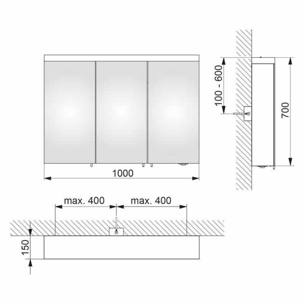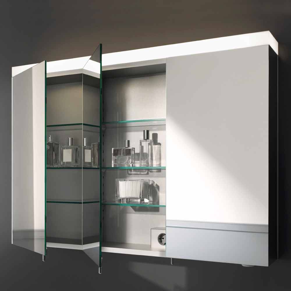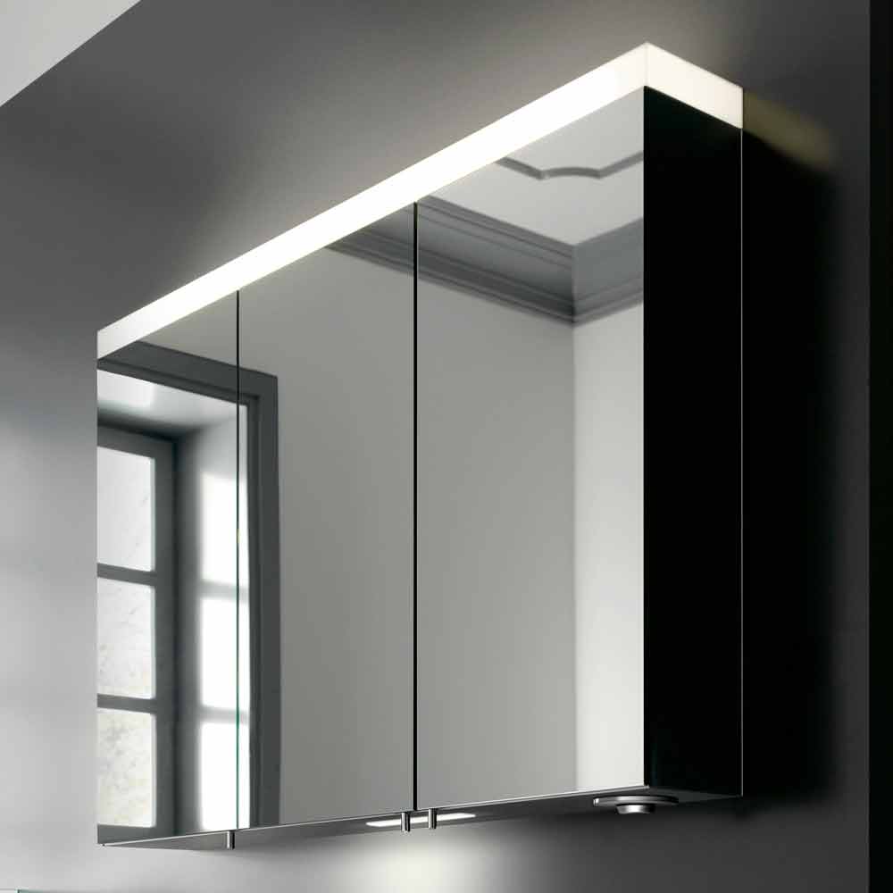Pasqyrë kontejner për montim në mur e pajisur me 3dyer me varet pasqyre (gjithashtu të brendshme) dhe pasqyra anësore. Dizajni i tij duket si një riinterpretim modern i një stili më tradicional i pasuruar nga teknologjia e mrekullueshme inovative LED që e bën produktin edhe më origjinal dhe të rafinuar. Ky lloj ndriçimi lëshon një rreze të ngrohtë të dritës së bardhë, e aftë të krijojë një atmosferë të rehatshme dhe mikpritëse. Së bashku me atë ballore që mbulon pjesën e sipërme të pasqyrës, ky artikull pasurohet nga ndriçimi i poshtëm që nxjerr në pah rubinetat. Ekziston edhe një dimmer praktik rrotullues i pozicionuar poshtë kabinetit që ju lejon të vendosni midis 3 mënyrave të ndryshme të ndriçimit dhe të zbehni intensitetin e dritës. Brenda 2 dyerve të mbyllura të buta ka edhe 6 rafte xhami të rregullueshme në lartësi sipas nevojave tuaja dhe 2 priza elektrike ideal për të rimbushur pajisjet tuaja elektronike edhe kur dera është e mbyllur.