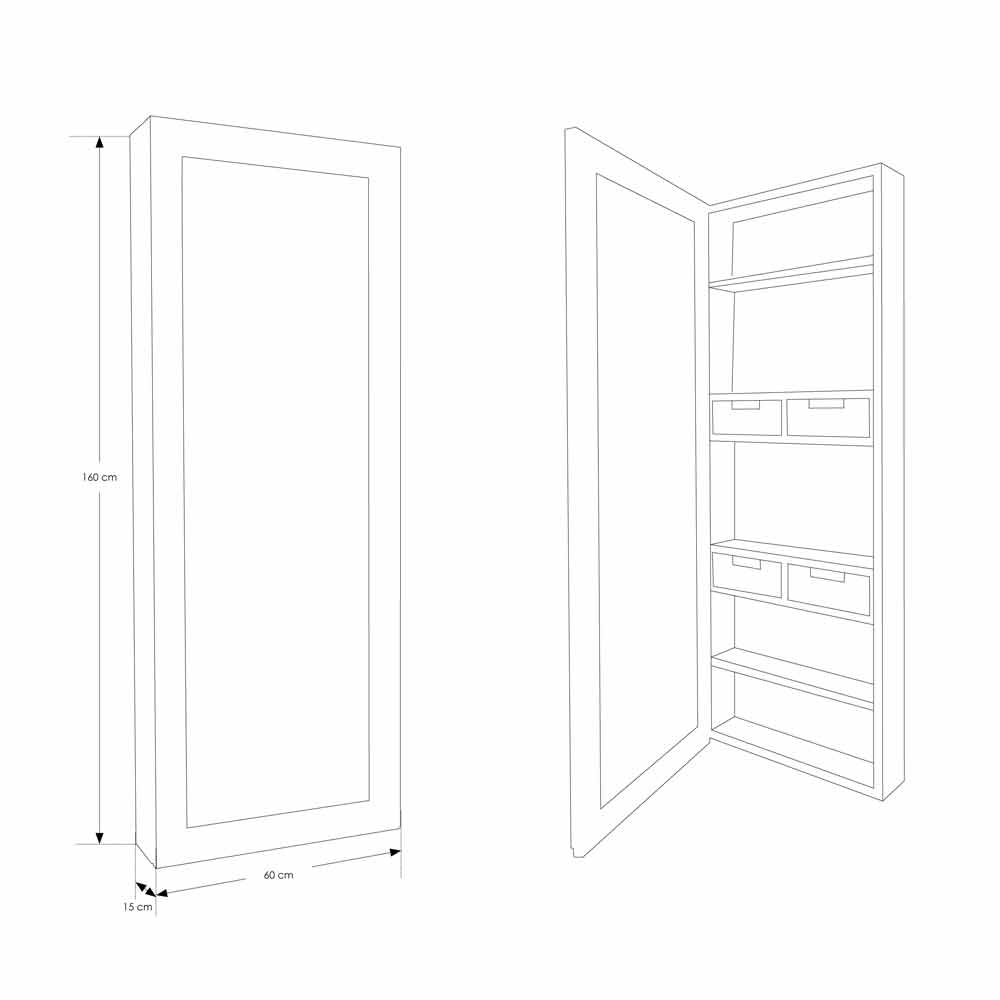 Pasqyra me kornizë dhe strukturë në Burma Teak të çmuar është gjithashtu një enë përrallore. Kur hapet dera/pasqyra, ka 4 rafte dhe 4 sirtarë. E përkryer për kozmetikë dhe ilaçe, për produkte higjienike ose bizhu. Ajo gjen vendin e saj jo vetëm në banjë, por mund të përdoret në dhomën e gjumit, dhomën e ndenjes ose korridorin! Furnizohet me shtojca muri dhe udhëzime me vida të bashkangjitura dhe fisher për montim.