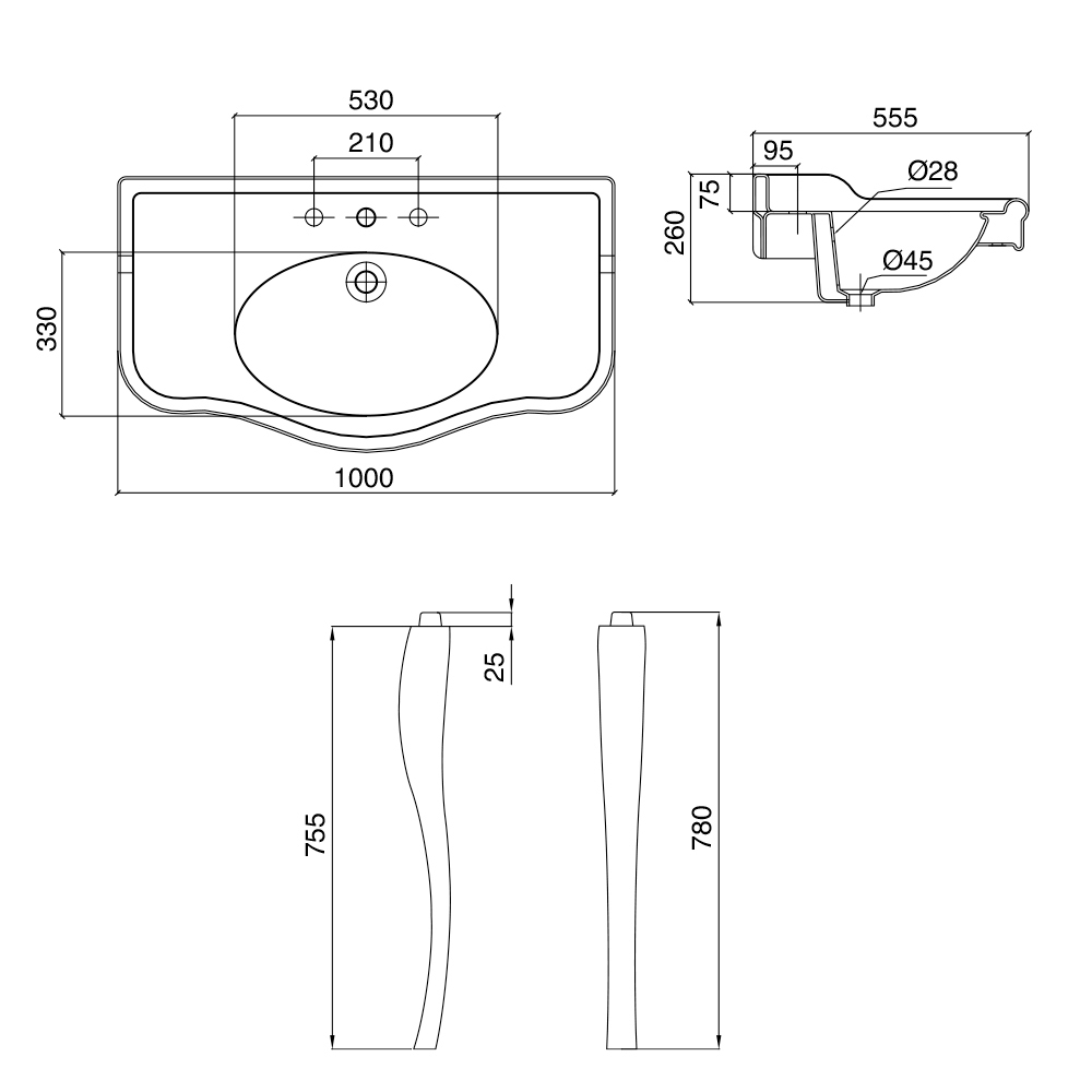 - maja: L 100 x D 55.5 x H 26 cm me vaskë të vetme; këmbët: H 78 cm me spërkatje dhe skaj mbrojtës spërkatje 1-3 vrimat e çezmës - L 1000 mm.
