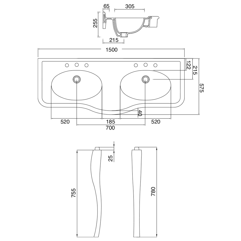 - maja: L 150 x 57,5 x H 25.5 cm me legen të dyfishtë; këmbët: H 78 cm me vrima të sipërme 1-3 për pajisjet e legenit - L 1500 mm;