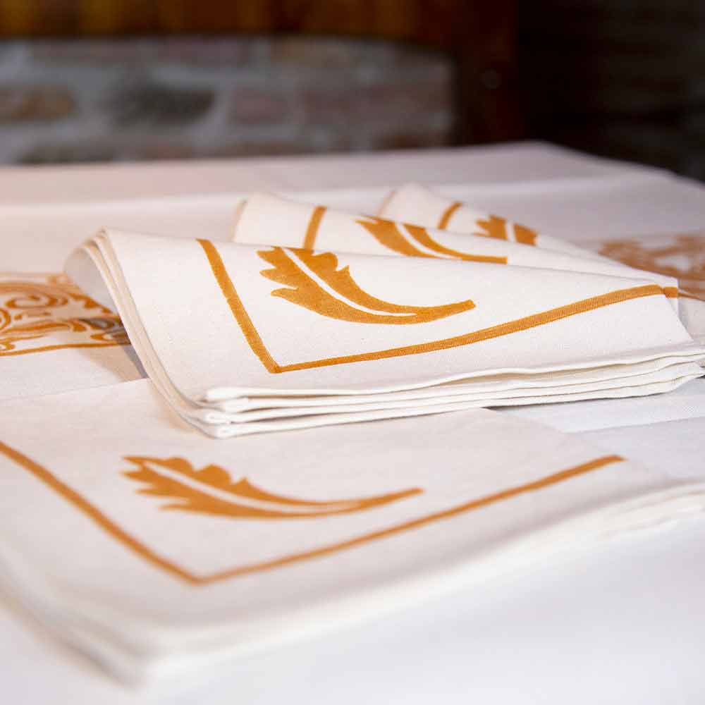 Pecetë e zejtarisë së lartë italiane në liri dhe pambuk, e bërë me teknikë të lashtë prodhuese me shtypje artistike të dorës në pëlhura të bukura, ndryshk ose dizajn blu, copë unike.