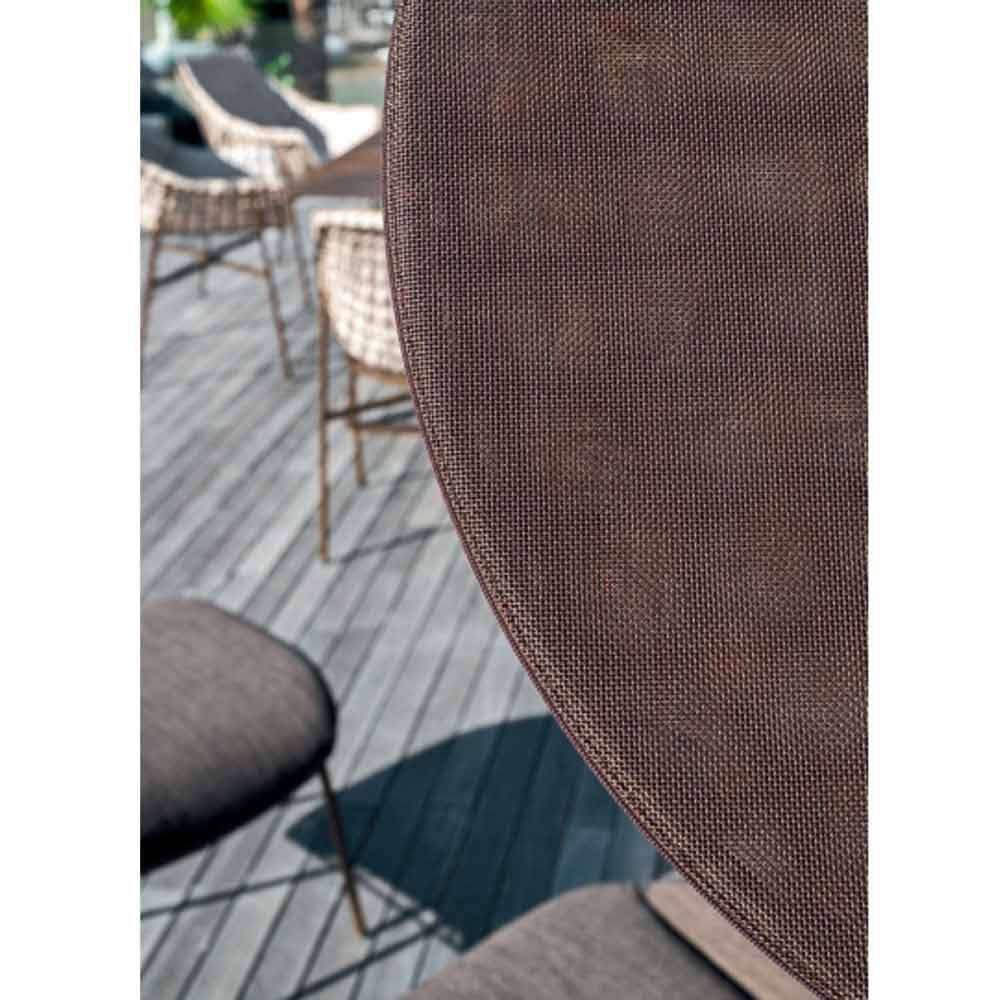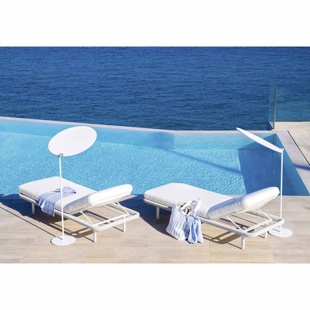 Ombrellë moderne e bërë nga pëlhura teknike PVC me strukturë alumini të veshur me pluhur dhe bazë të rrumbullakët në çelik të trajtuar. Pëlhura e përdorur për realizimin e saj ka mikro-vrima që rrisin anën funksionale pasi lejojnë kalimin e ajrit ndërsa bllokojnë veprimin e rrezeve të diellit të cilat mund të jenë të bezdisshme gjatë ditëve të nxehta të verës. Karakterizuar nga një dizajn thelbësor , ky produkt është konceptuar dhe dizajnuar për të përfaqësuar një zgjidhje praktike dhe lehtësisht të rregullueshme në çdo drejtim falë sistemit të rregullimit të ekranit 360 °. Elegante, funksionale dhe e lehtë për tu trajtuar, është një mobilje ideale për çdo hapësirë të jashtme ku përputhet lehtësisht me stilin përreth, duke i dhënë një prekje të personalitetit dhe stilit zonës së jetesës në natyrë në kontekste private ose kontraktuale.