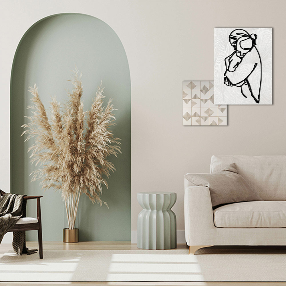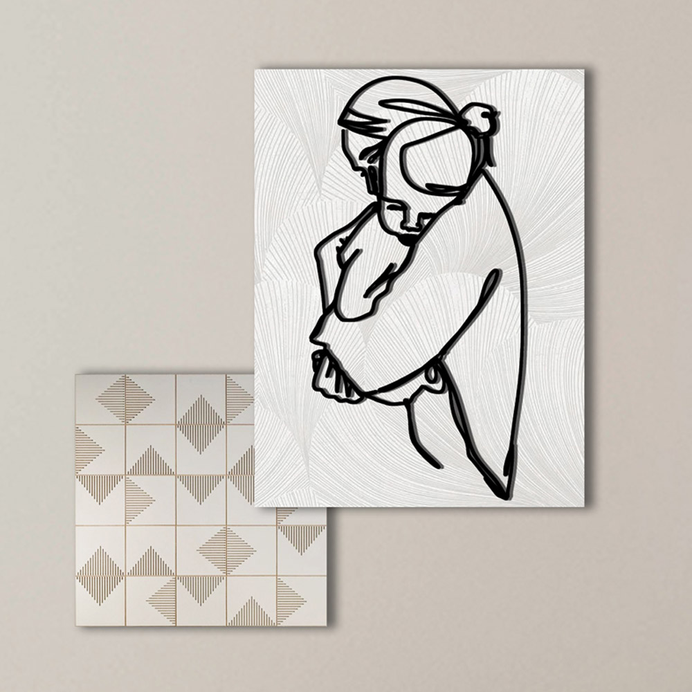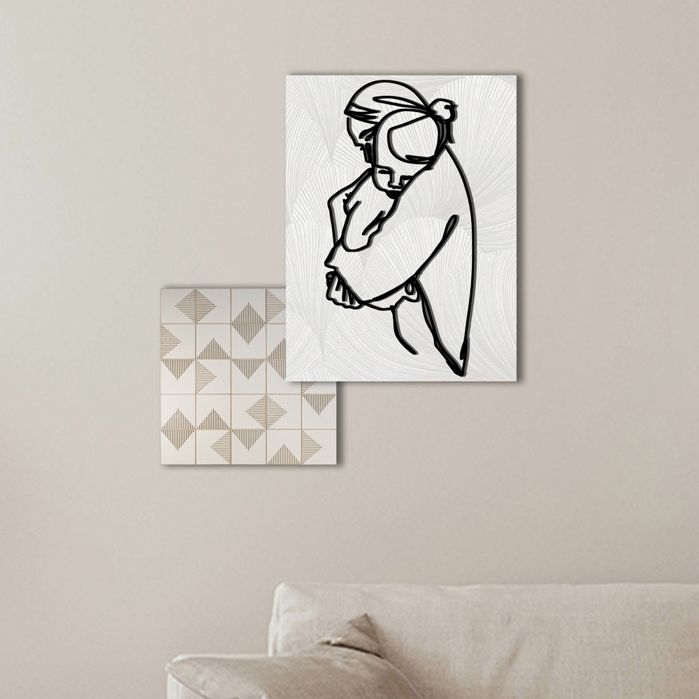 Përbërja e dy paneleve të formave dhe madhësive të ndryshme që kombinojnë dekorime lazer dhe printe. Dy pikturat mund të vendosen në mur sipas dëshirës, edhe veçmas.Përbëhet nga 2 panele druri të printuara : njëri drejtkëndor që paraqet një përqafim midis nënës dhe fëmijës dhe tjetri katror me motive gjeometrike trekëndore. Kompozimi ka avantazhin e madh se është vizatuar me dorë dhe stilizimi i përqafimit ngjall emocione dashurie dhe ngrohtësie tek vëzhguesi. Përfundimet unike dhe cilësia e shkëlqyer e materialit të përdorur për ndërtimin bashkohen për të krijuar një produkt me një dizajn unik.