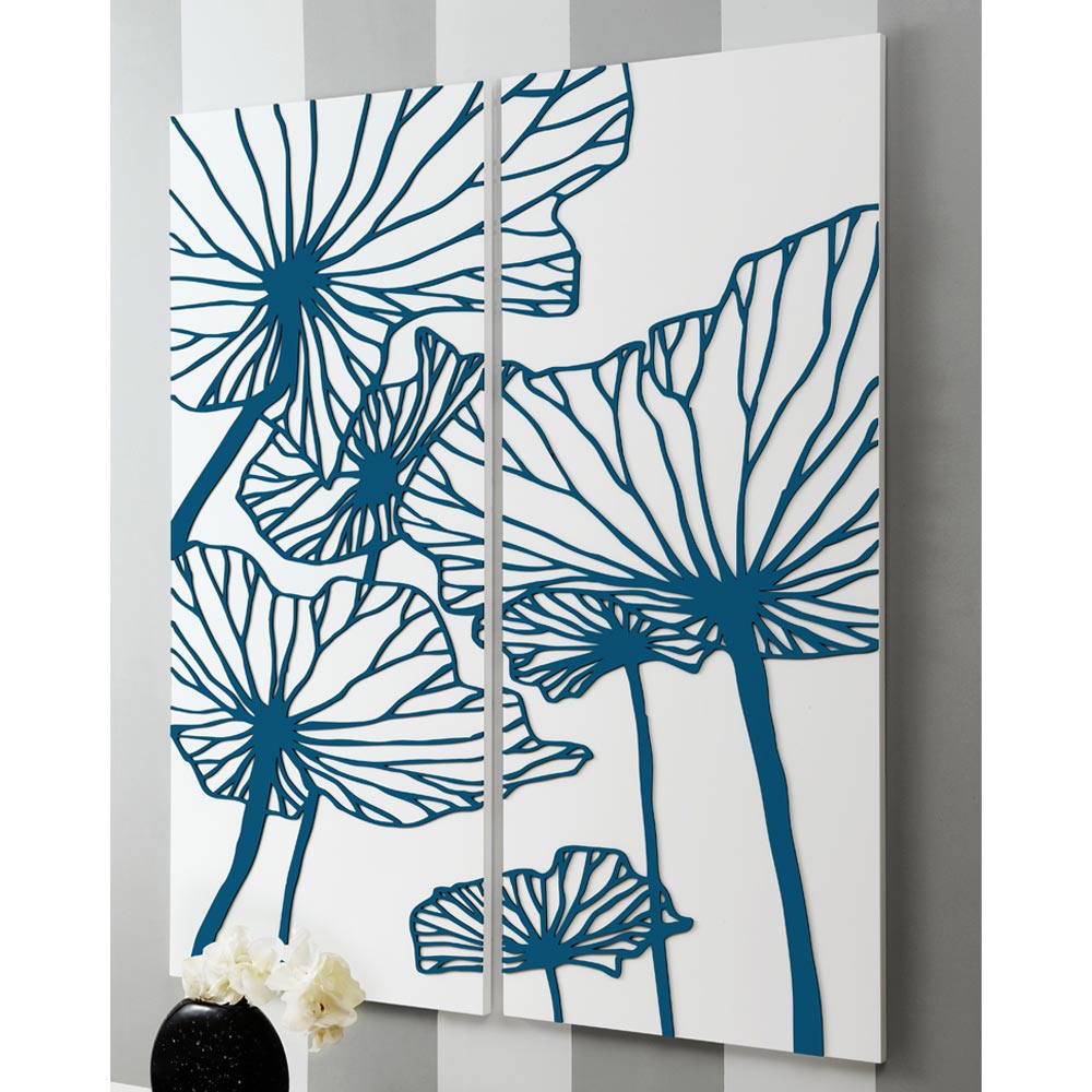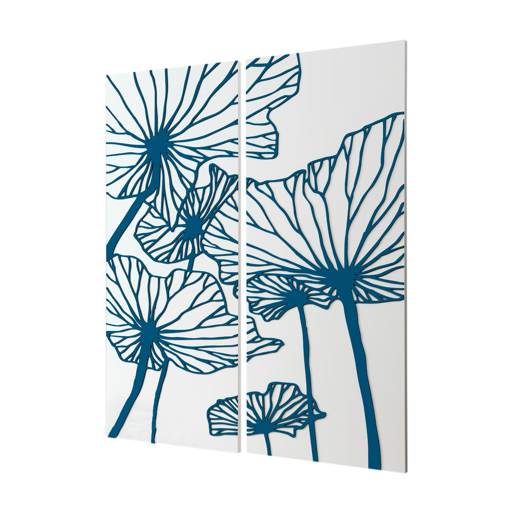 Përbërja e dy paneleve në dru me llak të bardhë mat me aplikimin e dekoreve prej druri me ngjyrë benzinë që paraqesin lule gjigante.