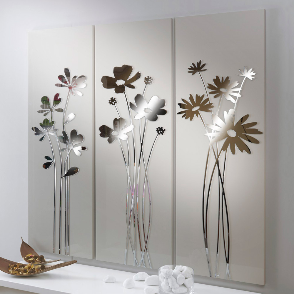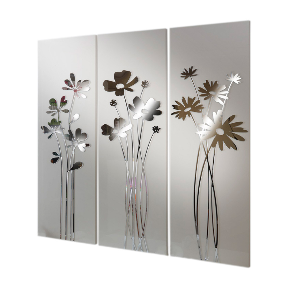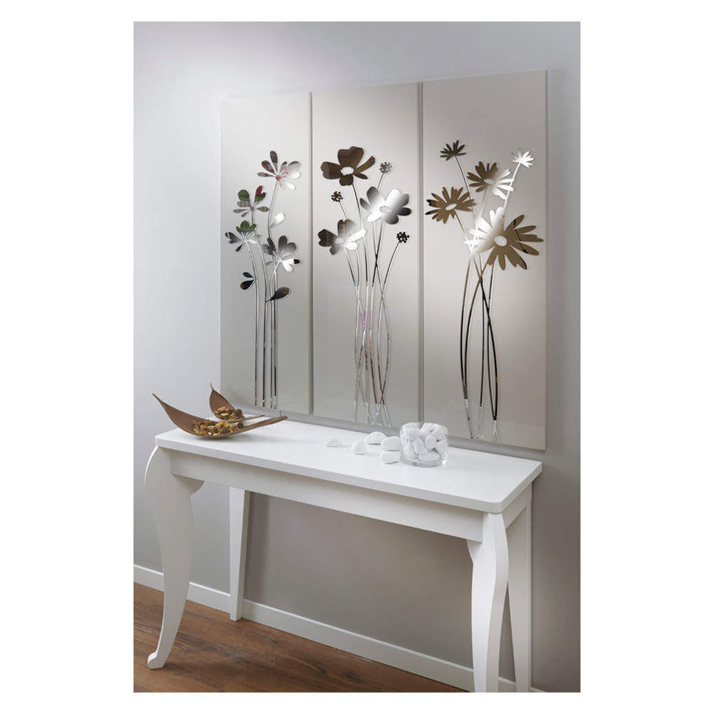 Përbërja e 3 paneleve për t'u varur individualisht në dru me llak me rërë me shkëlqim me aplikim në pleksiglas pasqyre që përshkruan buqeta me lule.