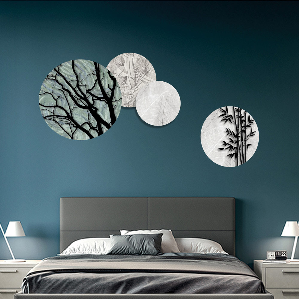 Dimensionet: 1) Paneli i sfondit jeshil/blu e çelët/gri: diametri 60 x P 2cm; 2) Paneli i gjetheve kafe: diametri 40 x P 2cm; 3) Paneli me gjethe të bardha: diametri 25 x P 2cm; 4) Paneli i gjetheve të bardha dhe degëve të zeza: diametri 40 x D 2cm.