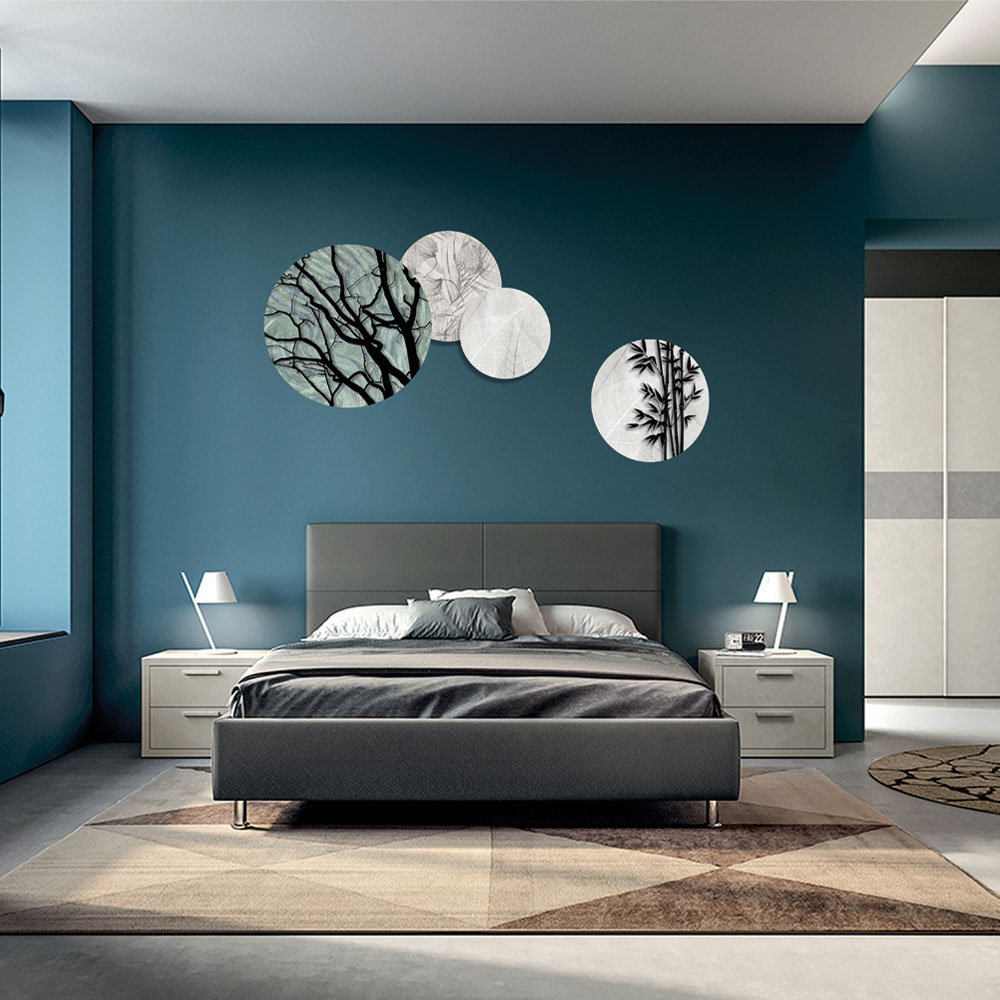 Përbërja e katër paneleve të madhësive të ndryshme që kombinojnë dekorime lazer dhe printe . Përbëhet nga katër panele rrethore në dru të printuar : njëra paraqet degë të zeza në sfond jeshil/blu/gri, njëra me gjethe në nuancat e sfondit kafe dhe rërë, njëra me gjethe të bardha dhe sfond gri dhe tjetra me gjethe të bardha dhe degë të zeza. Çdo panel është unik dhe mund të vendoset në mur sipas dëshirës, duke krijuar efekte të mbivendosura gjithnjë në ndryshim. Këto piktura janë rezultat i mjeshtërisë italiane, në fakt figurat vizatohen me dorë dhe më pas pikturohen me dritën e rrezes së lazerit, pa mbeturina dhe duke respektuar mjedisin. Bashkimi i përfundimeve dhe ngjyrave krijon një sugjerim vizual dhe emocional tek këdo që i vëzhgon dhe i jep mjedisit atë prekje unike dhe të përjetshme.