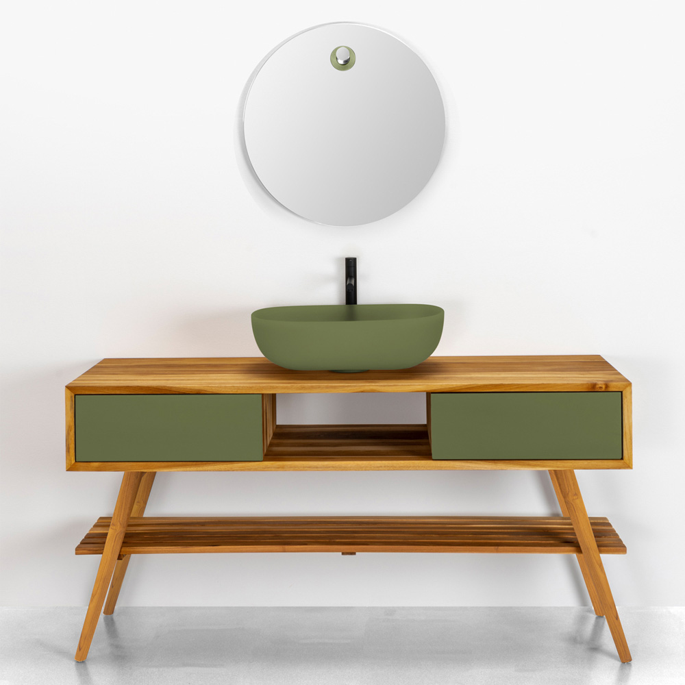 Lavaman rrëshirë me përbërje mobiljesh banjo dhe kabinet në dru tik dhe sofër.