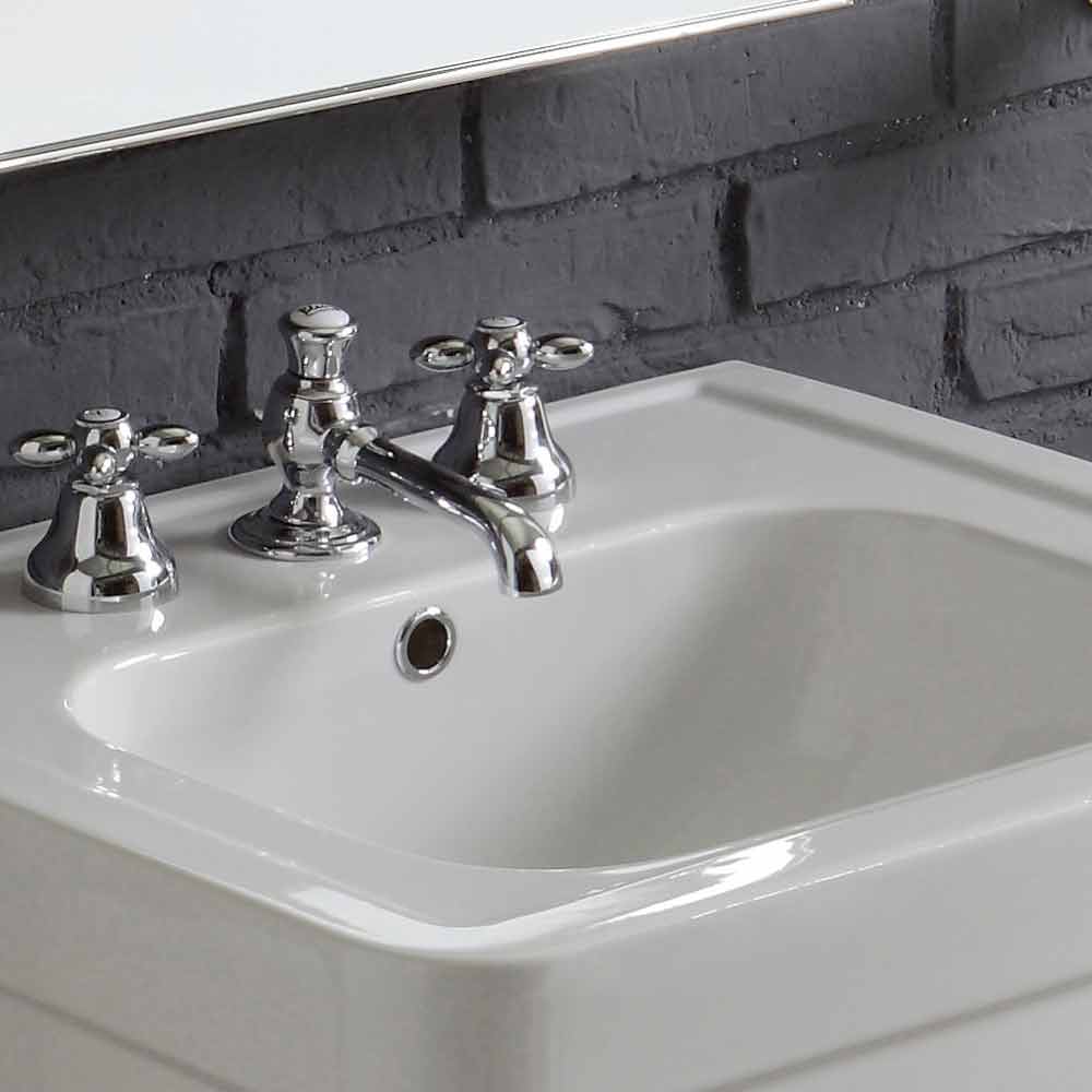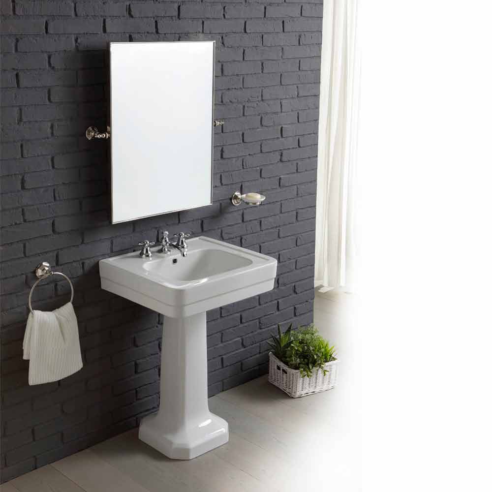 Pjesët e përfshira në përbërje: - Lavaman qeramik i bardhë. Matjet: L. 50 cm x D. 40.5 cm - Kolonë e bardhë qeramike. Matjet: L. 37.5cm x D. 35 cm x H. 69 cm - Trokitni lehtë me kullues - sifoni - Kulloni - Pasqyrë anësore drejtkëndëshe me kornizë bronzi të kromuar cm. 76.5 x 57.5. - Mbajtëse peshqiri unazë - Mbajtëse sapuni qeramike e montuar në mur