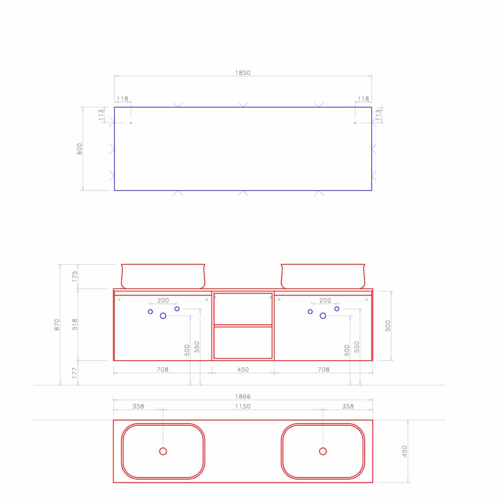 Isshtë një përbërje bashkëkohore dhe simetrike, e konceptuar me një lavaman të dyfishtë dhe njësi muri të ndara nga një raft i hapur që e mban dizajnin të pastër dhe të rregullt.