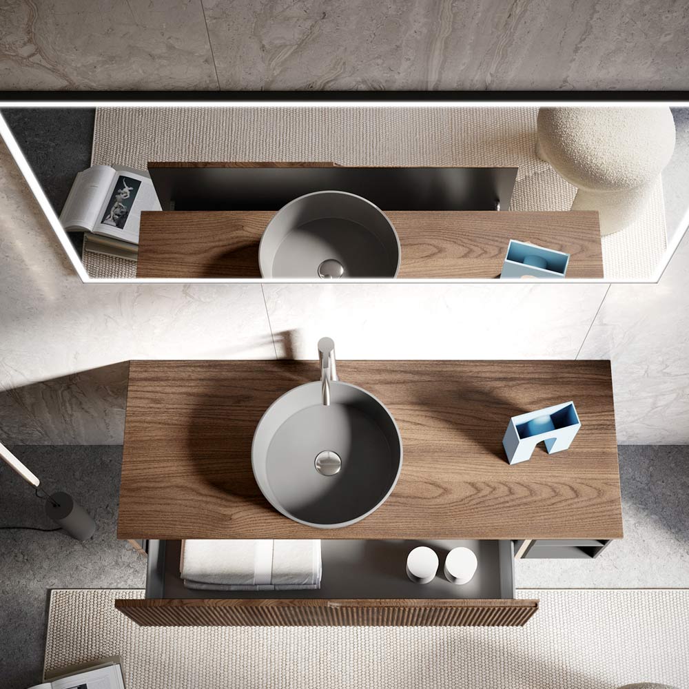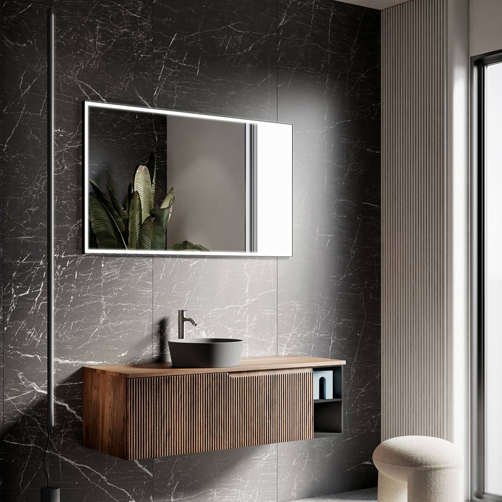 Përbërja e banjës tërësisht e prodhuar në Itali e përbërë nga një bazë me 1 sirtar në MDF me finiturë lisi Rio me brinjë, një element i hapur në MDF të lëmuar antracit, një lavaman qeramik i zi mat, një pasqyrë me dritë LED përpara dhe kornizë të zezë. Kjo përbërje e banjës është krijuar për të kombinuar stilin modern me funksionalitetin në mënyrë që të jetë në gjendje t'i përgjigjet nevojave të ndryshme të dizajnit dhe të jetë në gjendje t'i japë një prekje unike hapësirës. Përfundimet e thjeshta dhe lineare e bëjnë këtë mobilje elegante dhe elegante në të njëjtën kohë dhe përzihet me cilësinë dhe rezistencën e madhe të materialeve të përdorura për krijimin e tij.
