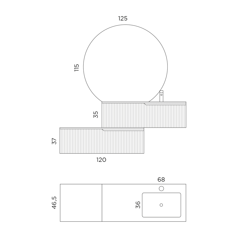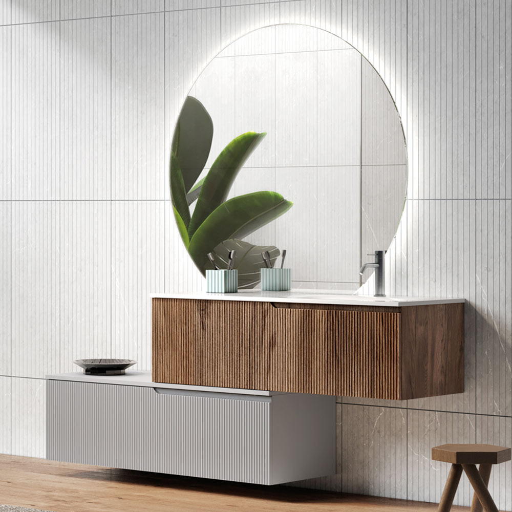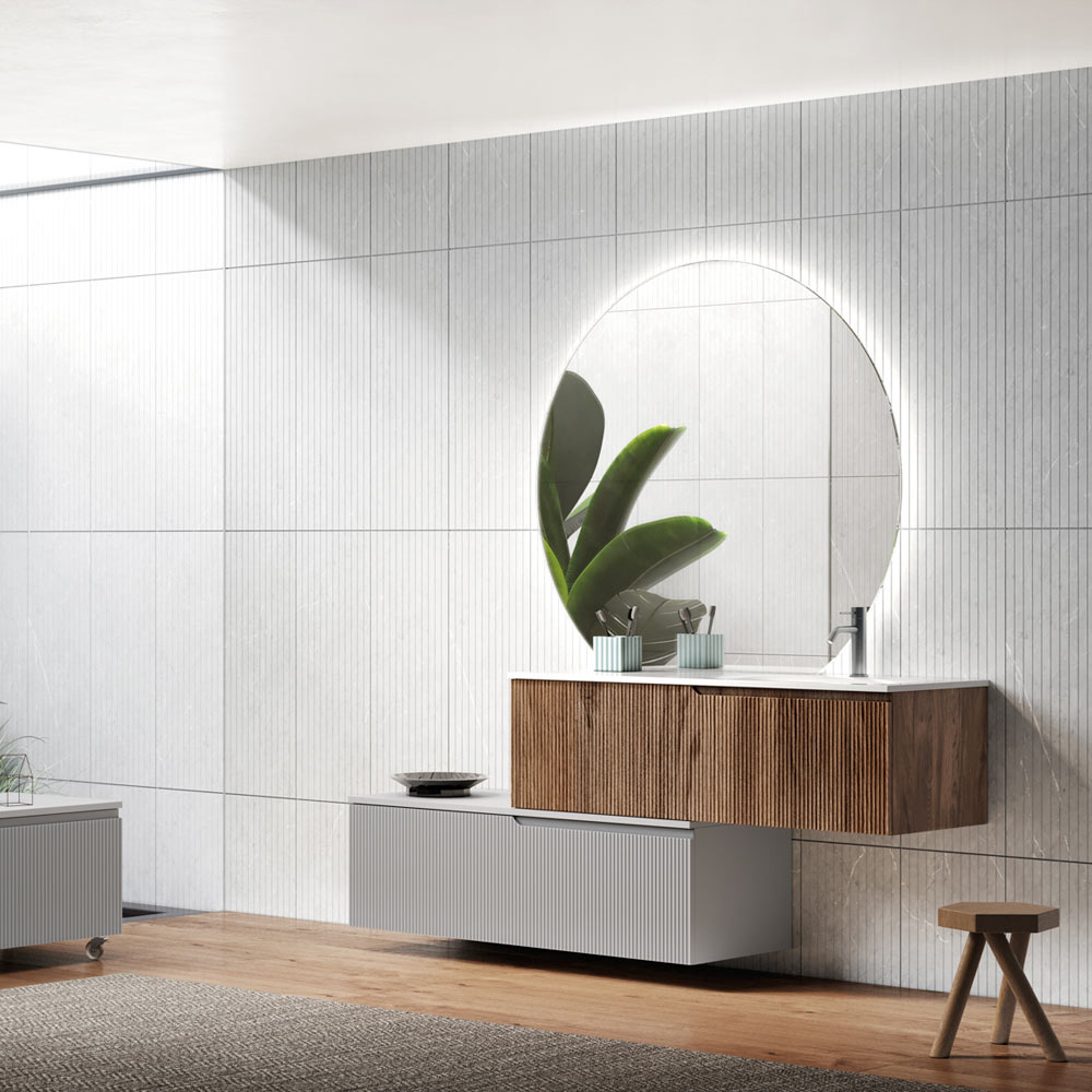 Përbërja e banjës tërësisht e prodhuar në Itali e përbërë nga një bazë me 1 sirtar në MDF gri me brinjë dhe sipër me MDF të bardhë, një bazë me 1 sirtar në lis Rio me brinjë, një lavaman i bardhë qeramike, pasqyrë me dritë LED rrethuese. Kjo përbërje e mobiljeve të banjës synon të kombinojë dizajnin bashkëkohor me traditën italiane. Kështu lindin produktet emocionale që materializojnë përvojën elegante dhe të këndshme të ambientit të banjës, përmes lartësimit të vlerave të materialeve të përdorura, si kërkimi dhe inovacioni.
