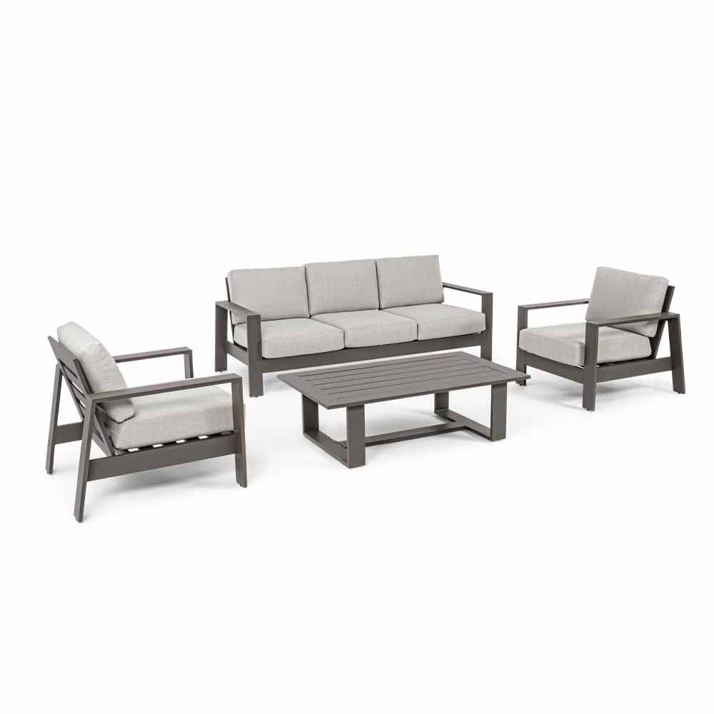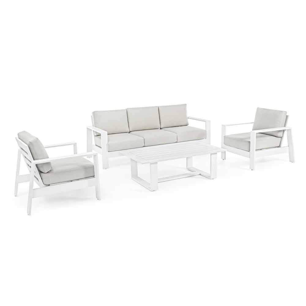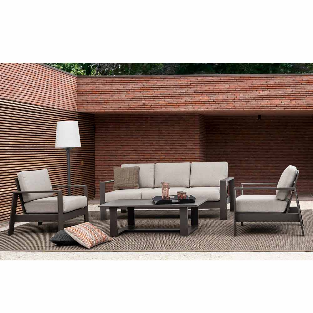 Sallë pritjeje në natyrë me divan, kolltuqe dhe tavolinë kafeje alumini.