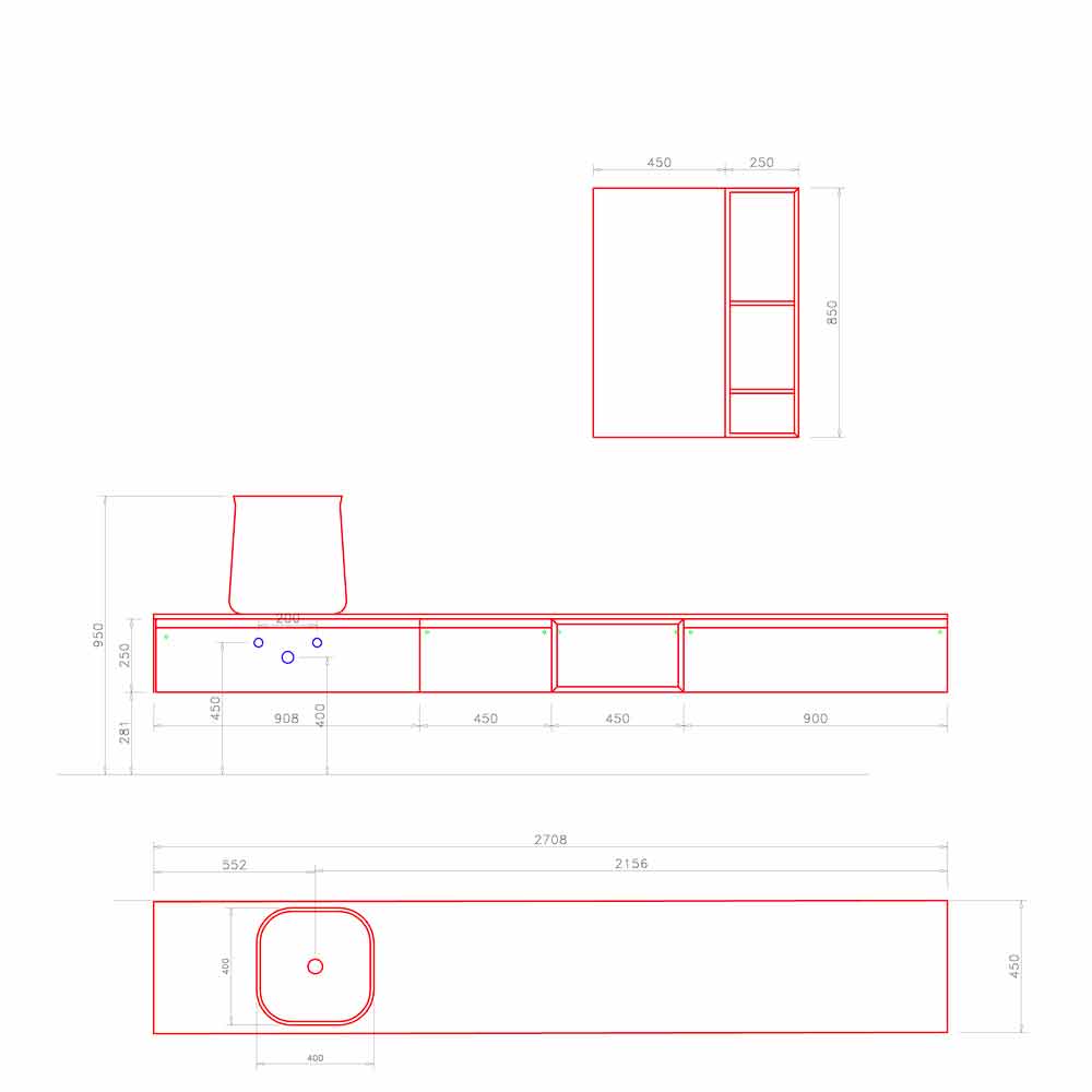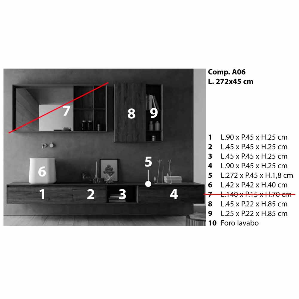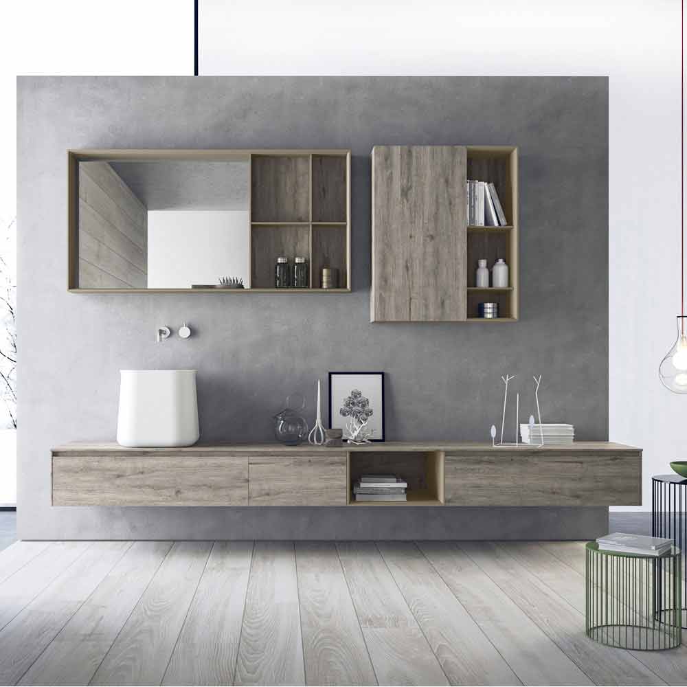 Përbërja e mobiljeve moderne të banjës, dizajn i varur dhe me gjymtyrë të gjata me lavaman countertop, prodhuar në Itali.
