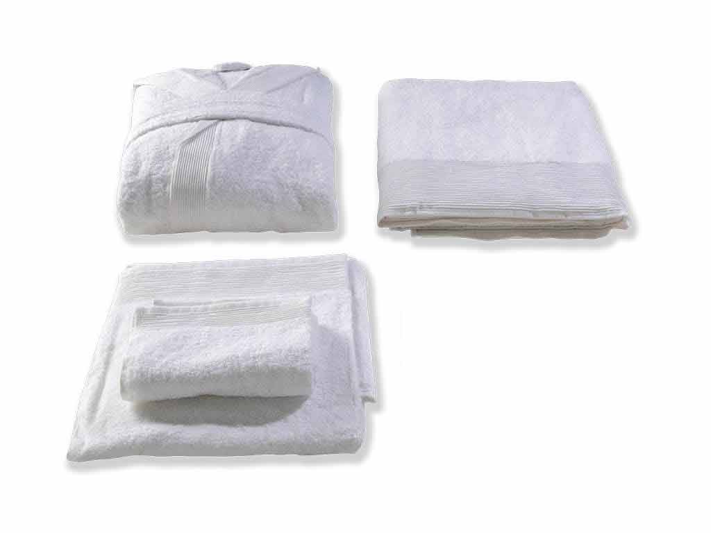 Rroba banjo dhe disa peshqir Material sfungjeri iriq 100% pambuk i pastër 420 gr/m2 me buzë pintuk. Rroba banjo me kapuç. Peshqir + mysafir.