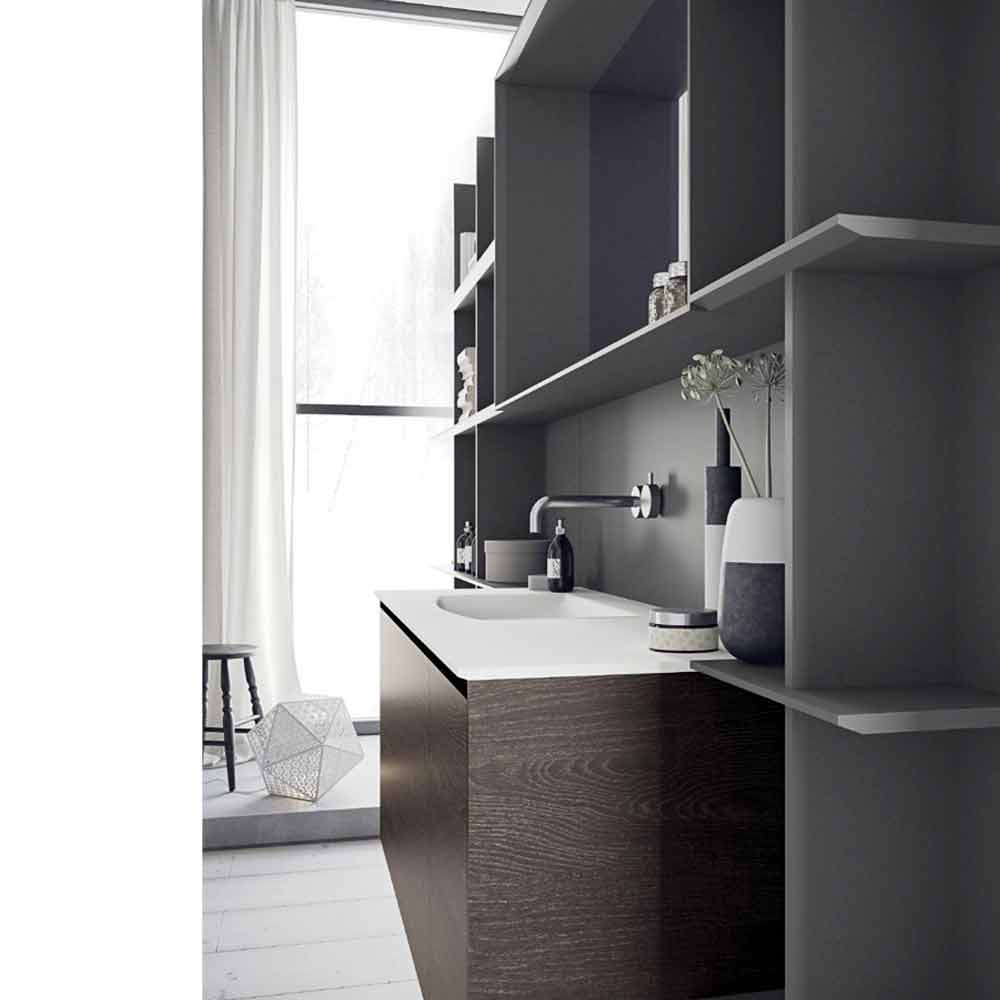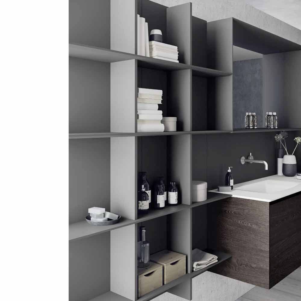 Përbërja moderne e banjës, dizajn i varur dhe i rregullt me rafte të hapura, prodhuar në Itali.