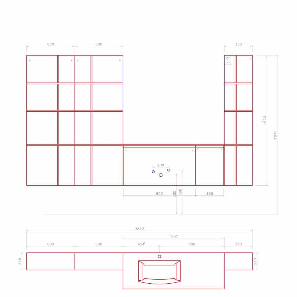 Veçantia e kësaj përbërjeje jepet nga rregullsia dhe simetria e dizajnit të të gjithë përbërjes përfundimtare, e cila krijon një ndjenjë të fortë të vazhdimësisë dhe stabilitetit, si një pikturë me dimensione të rëndësishme që merr lehtësi vizuale falë lojës së vëllimeve të hapura raftet, duke pohuar prekjen e modernitetit.