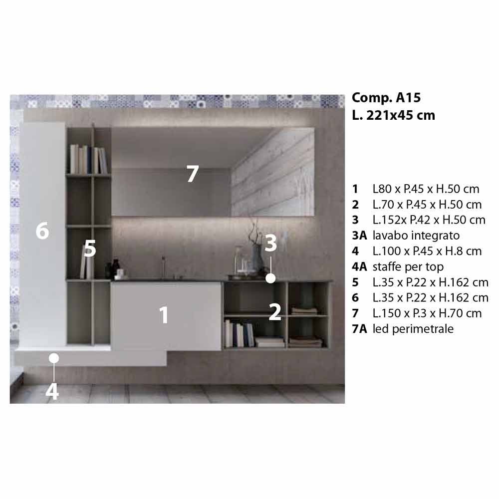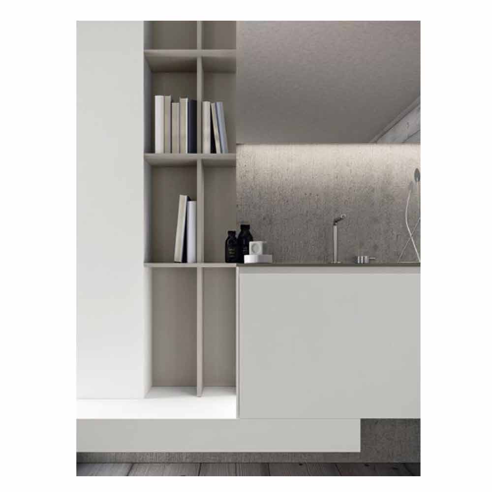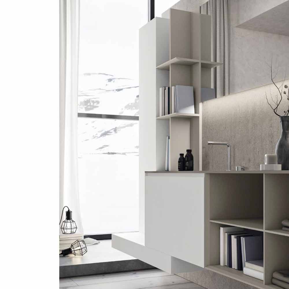 Përbërja moderne e banjës së varur, dizajn i rregullt me rafte të hapura, prodhuar në Itali.