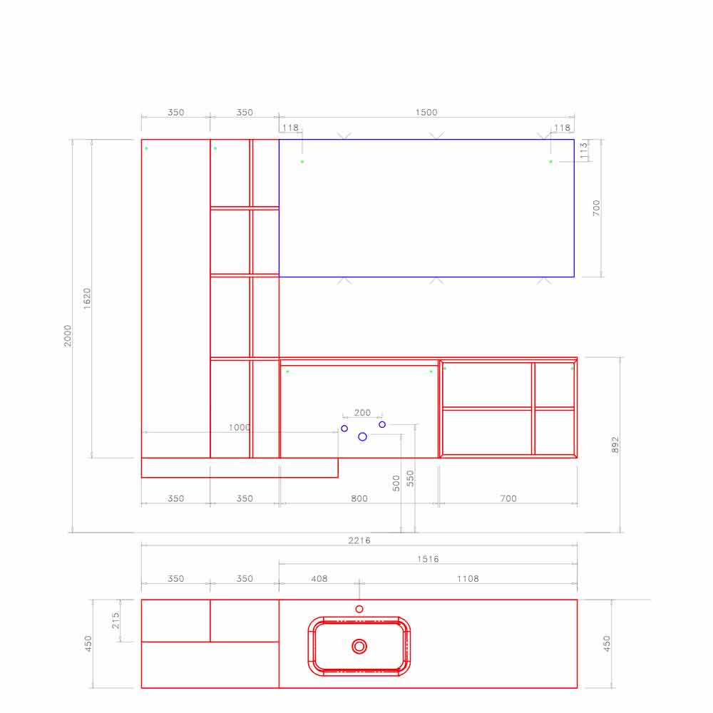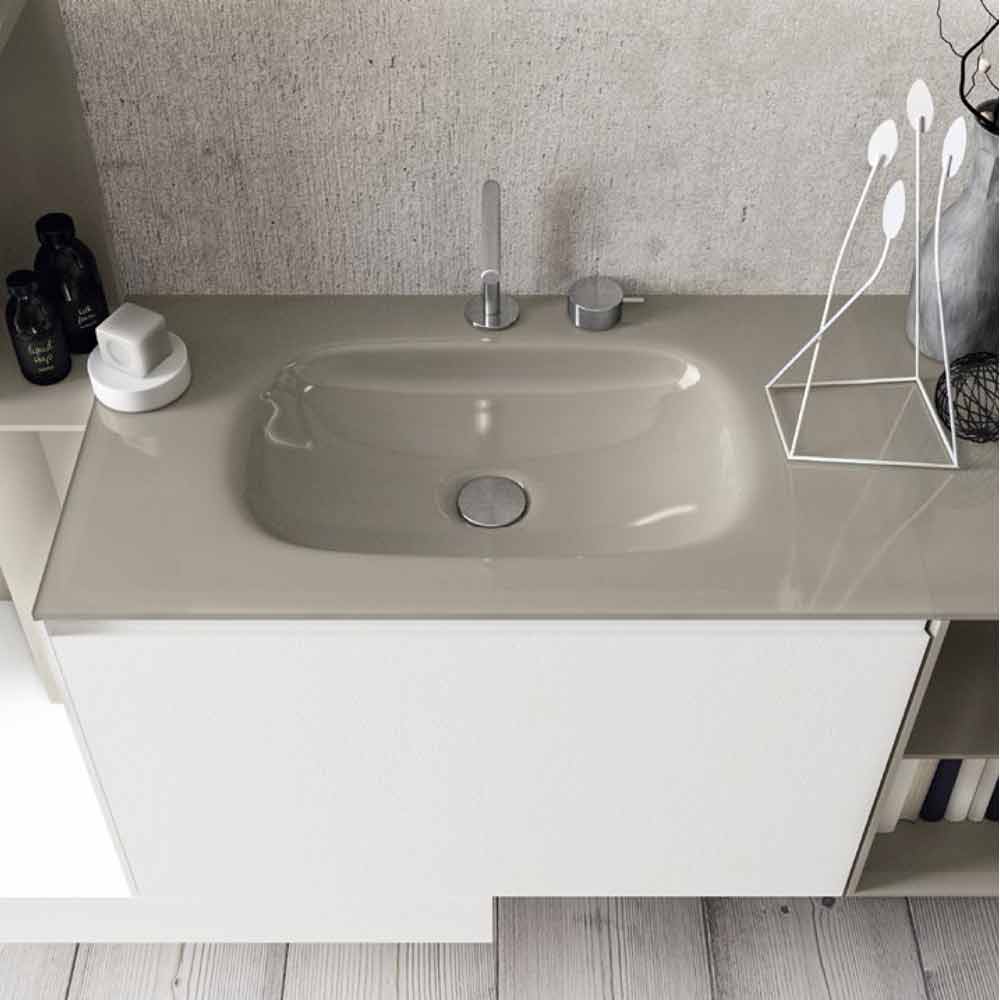 Skena përmbyllet nga lavamani i integruar me skaje të buta në raftin e xhamit.